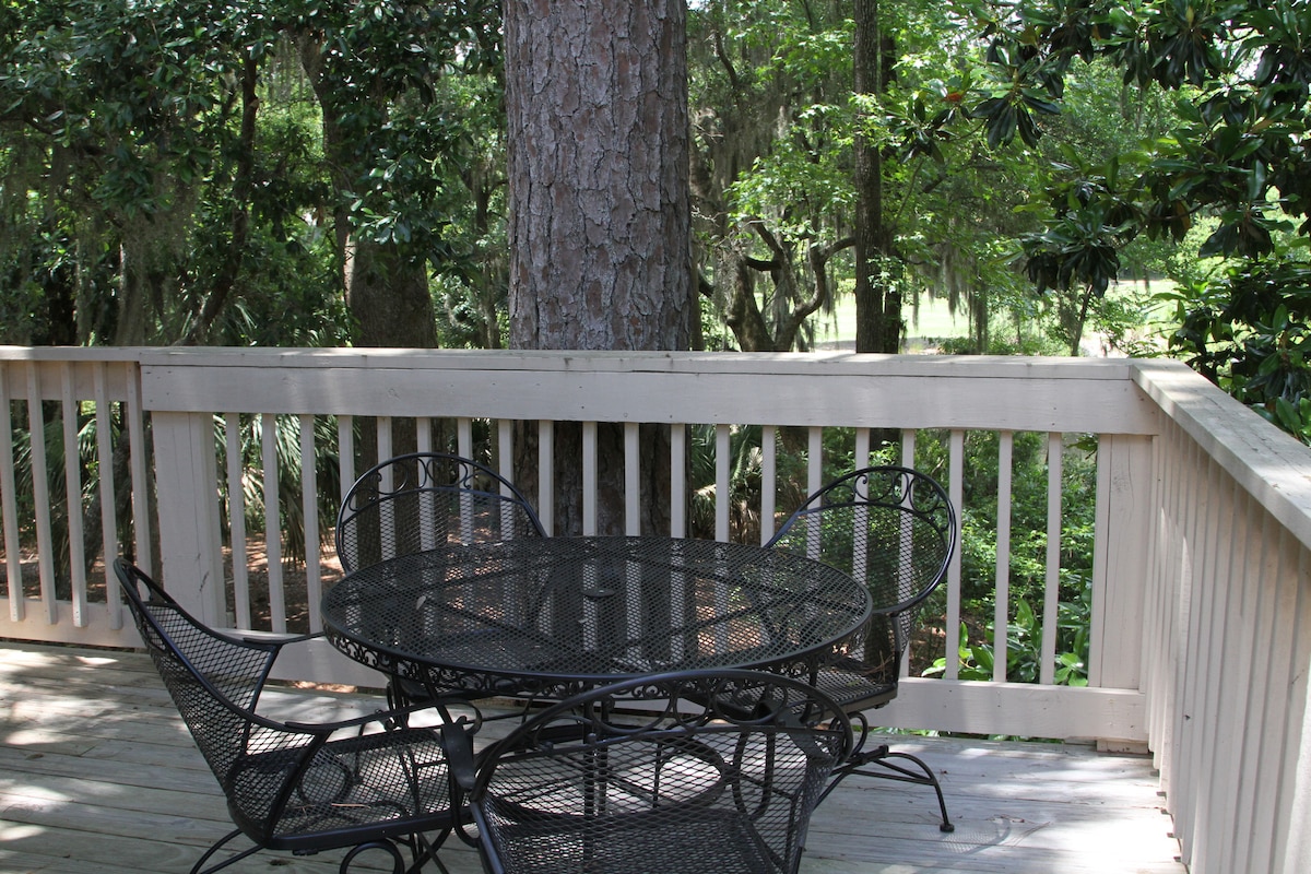 Welcome to our upper level end unit nestled in the gated Shipyard Plantation. After a day of exploring, golf, tennis, beach or shopping at Coligny Circle, the wrap around deck is a peaceful setting surrounded by lush low country foliage to wind down. Kids, keep an eye out for the occasional deer passing through. A short walk along a paved path lead directly to the beach. Saturday check in/out from April through August