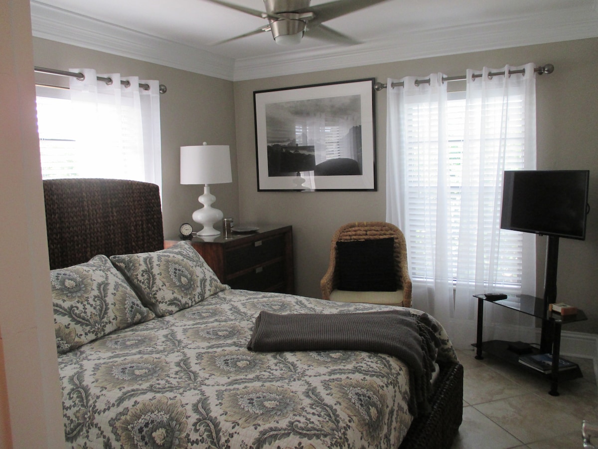 1~2명의 어린 자녀를 둔 부부 또는 2명 또는 출장자를 위한 휴양지로 적합합니다. 게스트하우스는 메인 숙소와 완전히 분리되어 있습니다. 침실 - 킹사이즈 침대. 소파, 24인치 높이의 트윈 에어 매트리스, 트윈 사이즈 침대가 있는 오토만. 완전히 스크린이 설치된 베란다/실내 난방 전용 수영장/8피트 벽(수영은 본인 책임입니다). 반려동물 동반 불가. 와이파이/케이블 TV. 해변/쇼핑까지 차로 10분 거리. 산책/자전거/조깅 코스. 자전거 4대(자전거 타기는 본인 책임)/바비큐 그릴/유럽식 아침 식사/다양한 간식/음료