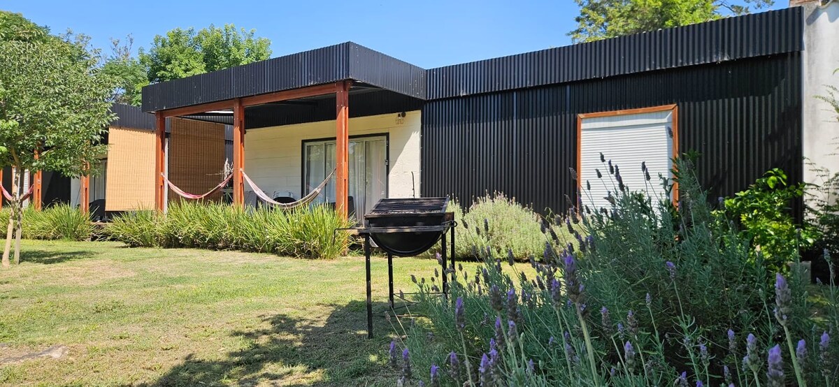Disfruta días de relax y naturaleza en mi Casa Contenedor. Su diseño fue pensado desde el reciclaje, en base a dos contenedores con su historia vivida en tantos viajes, decorada con muebles comprados en remates y algunos "rescatados" de volquetas Montevideanas, todos restaurados por mí. Construida en un espacio único, rodeado de pinos, a 4 cuadras del Río, con el amanecer que acompaña tus desayunos en el deck o living. Ubicada en la calle principal, frente al Aeropuerto y a 200mts de la ruta.