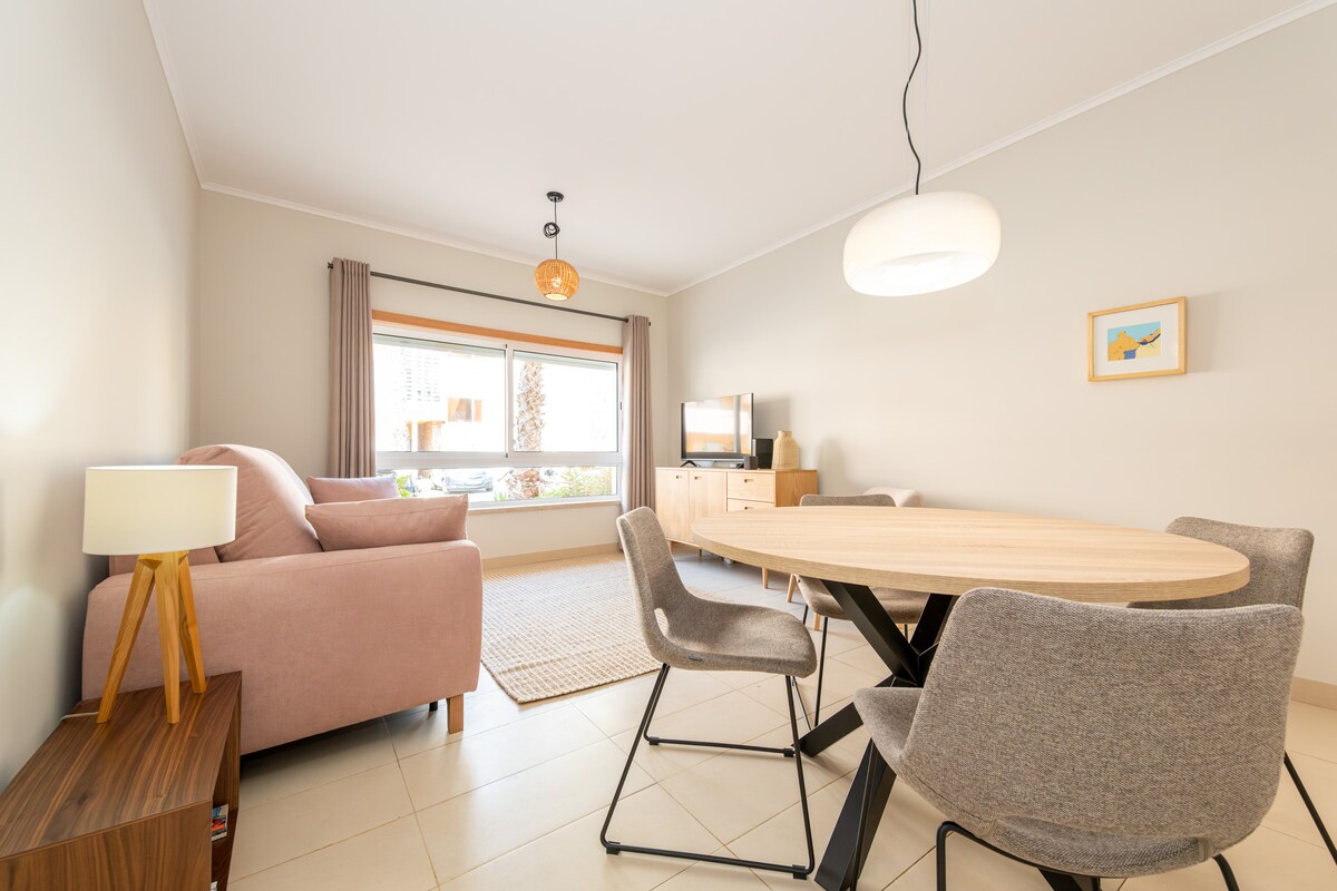 Sunny family apartment situated in a typical Portuguese village, with shops and restaurants close by. The bright and modern décor offers a super family holiday home with 2 bedrooms, 2 bathrooms and a sunny lounge balcony overlooking the pool for guest use only. A spiral staircase leads to a private roof terrace perfect for sun worshippers, and a 20 minute walk takes you to the quaint fishing village of Cabanas with its choice of superb restaurants and the boat to the golden beach island<br>