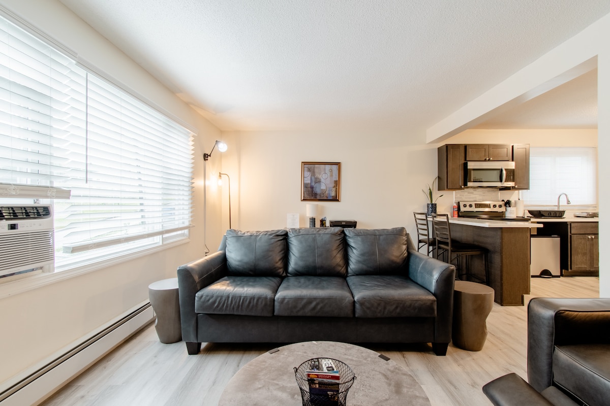 Kick back and relax in this calm, stylish space. This studio apartment offers fast internet, TV , a comfortable couch , a stylish new bathroom, a lovely kitchenette, as well as black out curtains in the bedroom. And a cozy warm fireplace. This apartment comfortably sleeps 1 adult or a couple. The couch folds out into a bed and there is bedding in a tote stored Under the bed.