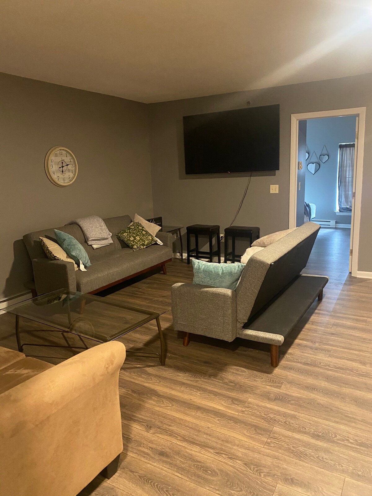 Quiet country setting in Glastonbury, Large 2 bedroom, 1 bath apartment, Private parking with a separate entrance. Fully furnished, perfect for students, minutes from downtown Hartford. Restaurants. Glastonbury Hills Country Club, scenic area. Beautiful location. Convenient laundry access. Extended Stays (weekly and monthly) are available with discounts. Please check for availability. Kick back and relax in this calm, stylish, quiet country setting space.