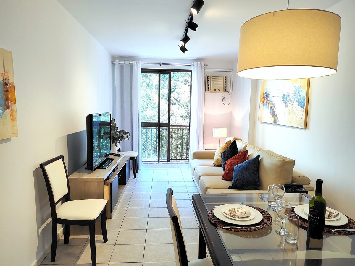 현대적으로 새롭게 단장한 편안하고 고급스러운 싱글 침실 아파트. 해변, 레스토랑, 리오술 몰에서 몇 걸음 떨어진 호텔 내부에 편리하게 위치해 있습니다! 코파카바나에서 가장 안전한 지역에 있는 가장 인기 있는 관광지와 대중교통에 가깝습니다 (호텔 문에 24시간 경찰이 있습니다!). 이 숙소에는 일일 청소 서비스를 포함한 모든 호텔 서비스가 당일 요금에 포함되어 있습니다. 현대적인 고급스럽고 독특한 건축물과 숲 전망의 프라이버시가 멋지게 어우러져