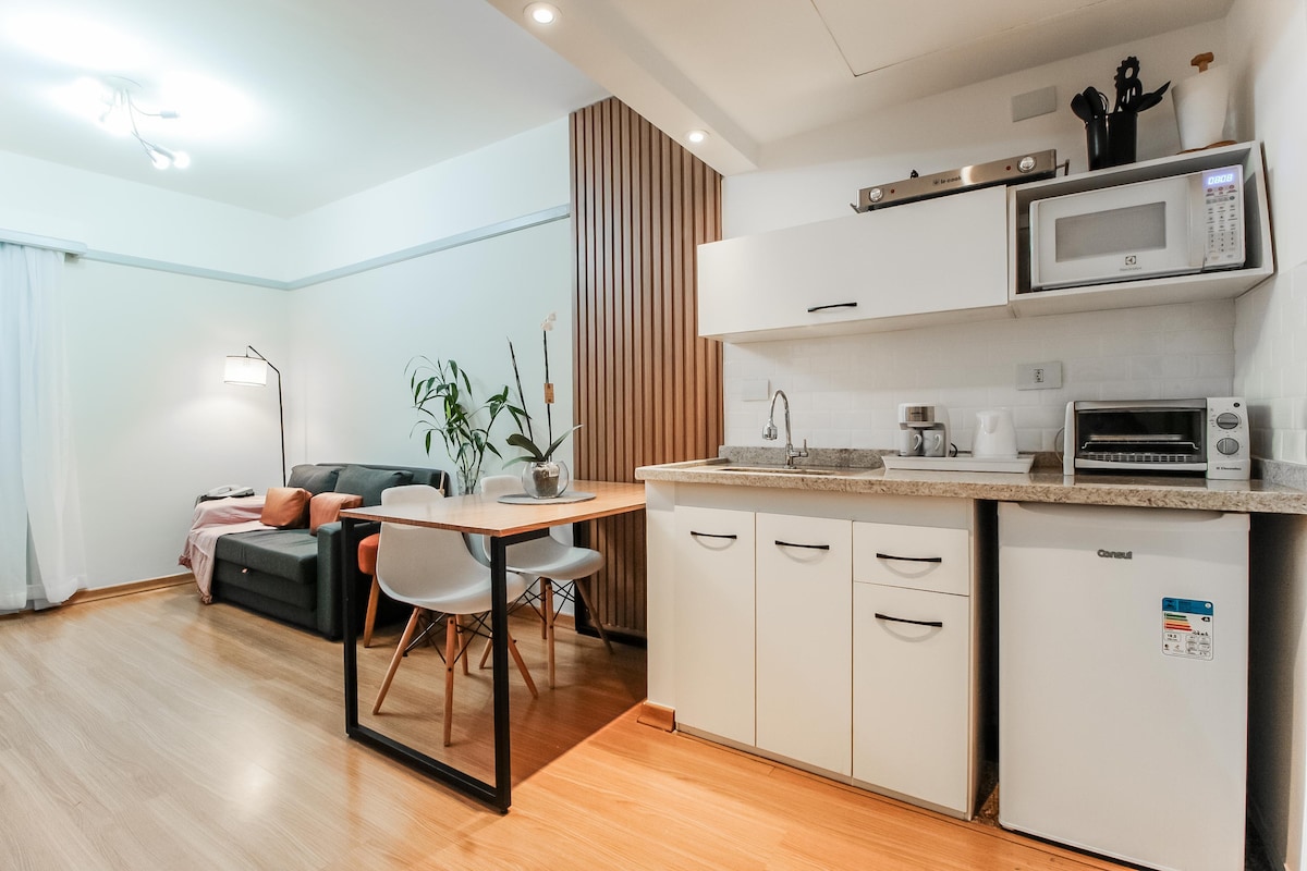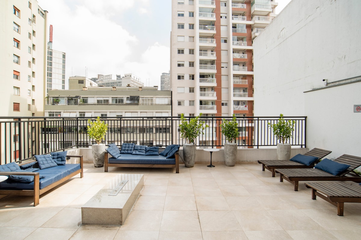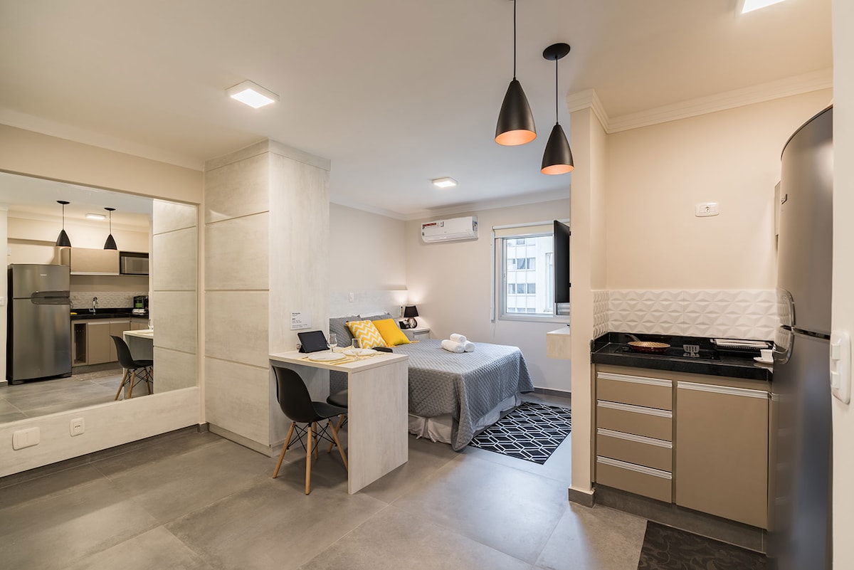 Curta uma experiência elegante neste lugar bem-localizado. Tem todo conforto e segurança. Cozinha completa para suas refeições rápidas. Poder se hospedar em um aconchegante e charmoso studio com terraço e vista. Super bem localizado, Wi-fi de alta velocidade, TV 32”e ar-condicionado. Piscina borda infinita na cobertura e academia à disposição. 350m do metrô e próximo a alternativas culturais, gastronômicas, noturnas, supermercado, farmácia e lojas.