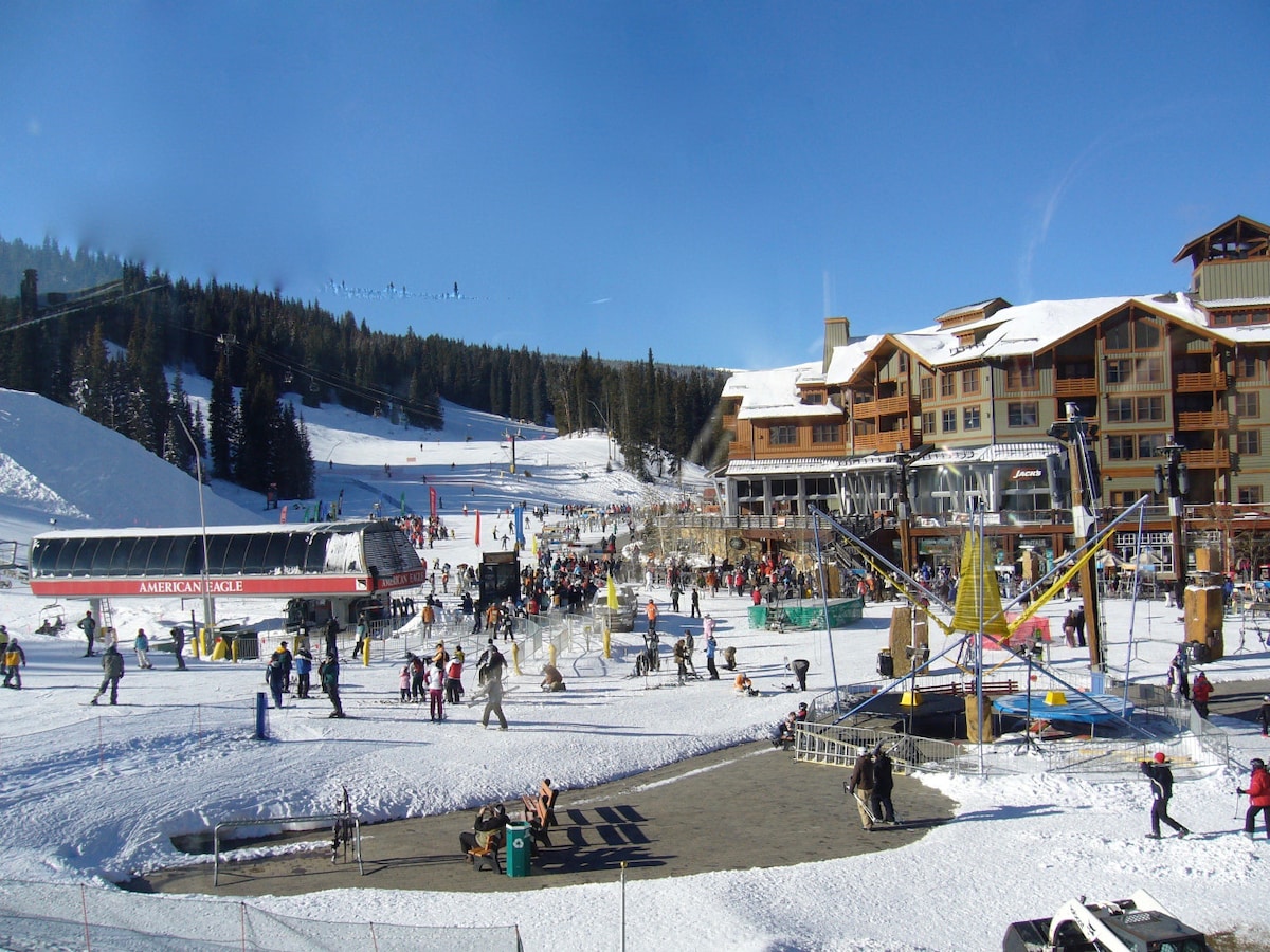 Updated slope-side condo in Center Village with views of the American Eagle lift. True ski-in/ski-out with on-site parking, elevator access, and a slope-side ski locker. Sleeps 6 with 6 beds: loft king, Cal king window bed, convertible leather daybed (two twin XLs), plus two twin floor mattresses. Sunny south-facing dining nook, vaulted ceilings, and a cozy gas fireplace. Please note: loft is open and accessed via a spiral staircase.
