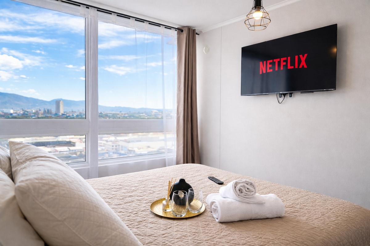 독점적인 아파트, 현대적이고 안전하며 편안합니다. 잠시 머물거나 휴가를 보내기에 이상적입니다. 15층에 위치하며 비교할 수 없는 파노라마 전망과 넓은 발코니를 갖추고 있습니다. 구내 주차장, 와이파이, 헬스장, 퀸초, 수영장. 세탁(선불 카드로 사용). 산 파블로 병원, UCN, 프란시스코 산체스 루모로소 스타디움, 모스크 등이 가까이에 위치하고 있습니다.