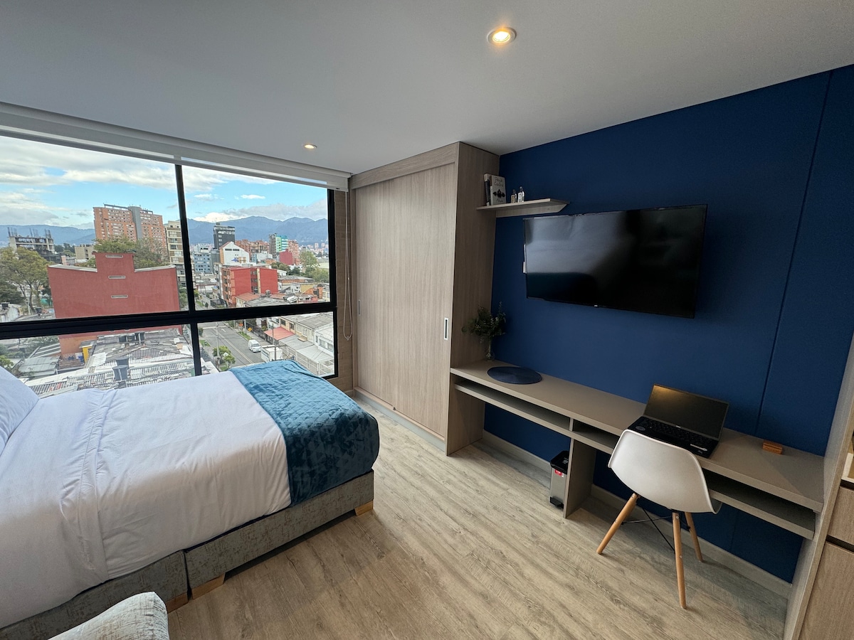 Loft-style studio apartment with 24/7 access, located on the 11th floor with an incredible 180° view of the city, natural light, modern, and cozy. Strategically situated in the Chapinero Central sector in a new building, very close to banks, pharmacies, supermarkets, shopping centers, restaurants in Zona G and Zona T, Centro Internacional, and La Candelaria, bars, theaters, museums, El Campin Stadium and Coliseum, parks, etc.