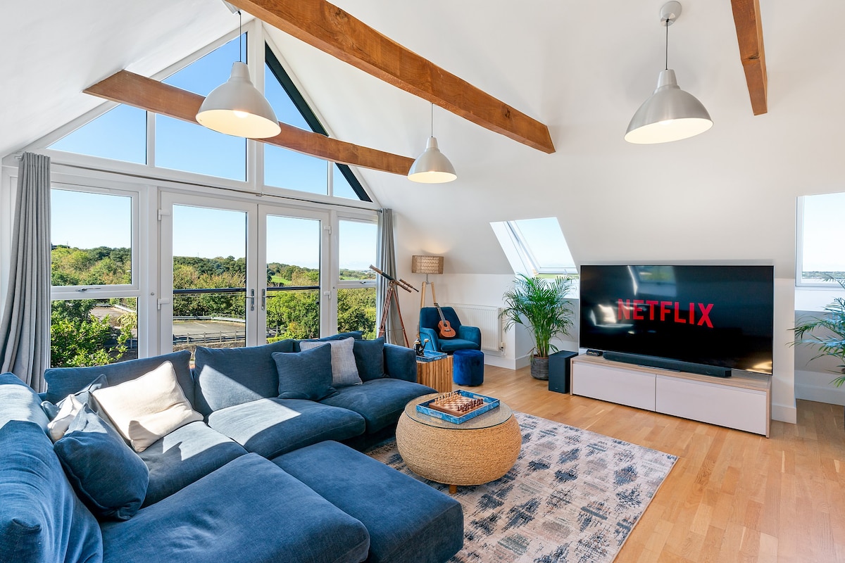 Nestled in the beautiful Cornish countryside, this Scandinavian inspired building with its high pitched roof & cladding is set just behind the dunes of Penhale and make for a great space to relax and unwind. Internally it is a bright open planned space with modern fixtures and fittings. The lounge upstairs is equipped with a drop down projector screen & projector perfect for those snuggle in evenings.