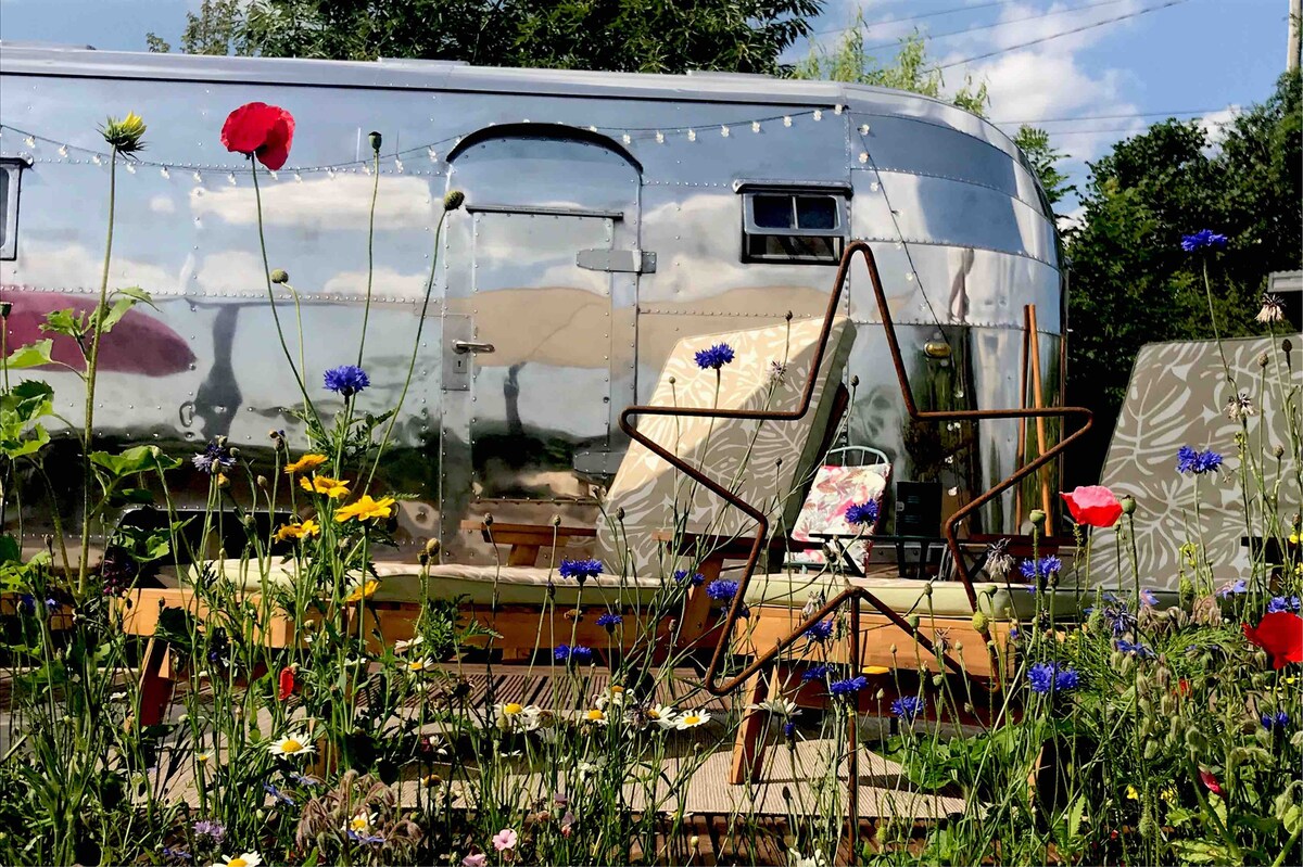 Marilyn is a beautiful, romantic, vintage silver Airstream, set within her own private enclosed meadow. She has her own large sundeck, sunken outdoor bath and cinema, sun recliners, fire pit & far reaching rural views. You can just relax in the rural retreat or explore the local area, where you will find, wild swimming, hiking in the Black Mountains, Forest of Dean or the scenic Wye Valley. There are many outdoor activities. eateries & independent shops. Just perfect for relaxing or exploring.
