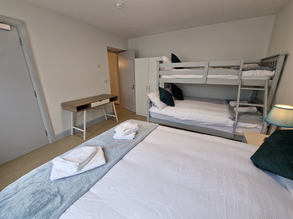 The whole group will enjoy easy access to everything from this centrally located ground floor apartment in Carrick-on-Shannon town centre, Free parking across the street or in large car park close by. Three bedrooms, one ensuite and one main bathroom plus large kitchen living room area.