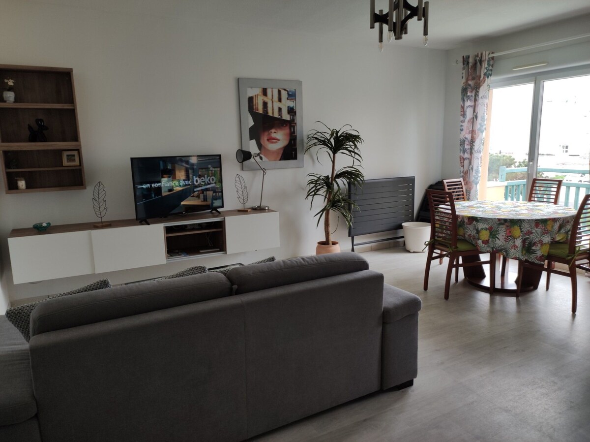 Bright flat 28m2 with balcony in a quiet residence with private parking space. Beach, restaurants, shops and station at 600 m. 1 Bedroom with a bed 140x190cm - In the living room, a sofa bed with mattress 140x190cm Comfortable bedding with pillows, duvets and blankets. Sheets and towels not provided, possibility to rent them (15€ for 2 persons kit) Fully equipped kitchen: Nespresso coffee machine, filter, kettle, toaster, hob, mini-oven and microwave.
