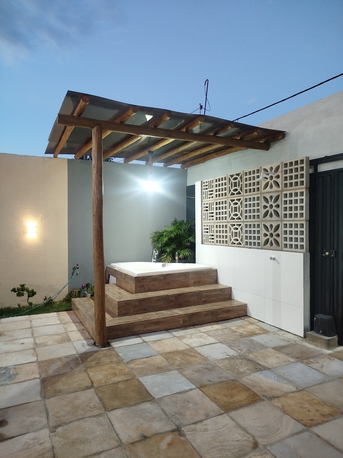Relaxe e aproveite dias tranquilos na Casinha Deck, um espaço acolhedor com piscina, cozinha completa, churrasqueira, quartos climatizados e banheiros com chuveiro eletrico. Nosso espaço é perfeito para famílias, casais ou grupos que desejam conforto e privacidade em um local privilegiado a 5 minutos do aeroporto e a 15 minutos dos principais pontos de turismo religioso da cidade.