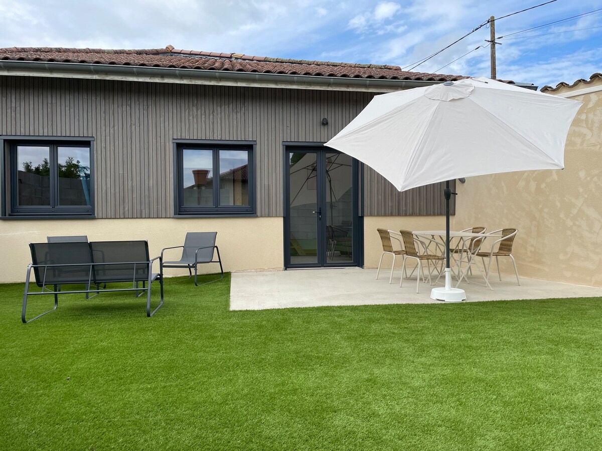 Relax in this quiet and elegant accommodation. Renovated, it features a living room/bedroom, a fully equipped kitchen, and a bathroom. You can also enjoy a shaded terrace for lunch, dinner, or simply relaxing in this peaceful village. This fully equipped apartment features high-speed Wi-Fi, a private entrance and parking, 10 minutes from the highway. The apartment has a double bed. An extra bed or baby kit is available if needed.