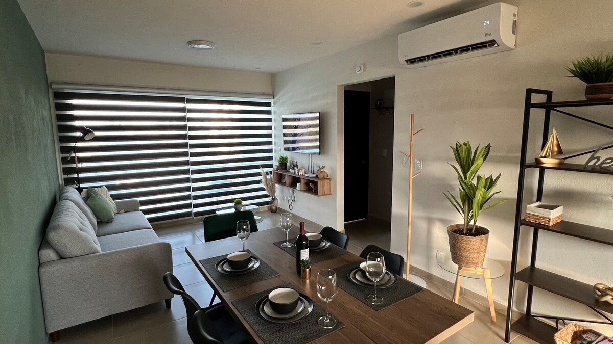 Vive la experiencia de viajar y sentirte en casa, contamos con todo para que tu estancia sea placentera, confortante y amena. Tenemos todo cerca, a 1 minuto del de la playa, 20 minutos del aeropuerto, designamos espacios seguros para tu estancia Comfort dentro de un edificio con acceso controlado, privado y sumamente seguro. Dos cajones de estacionamiento. 3 recamaras. Pet Friendly (mascotas). El departamento NO incluye la disponibilidad de la Alberca.