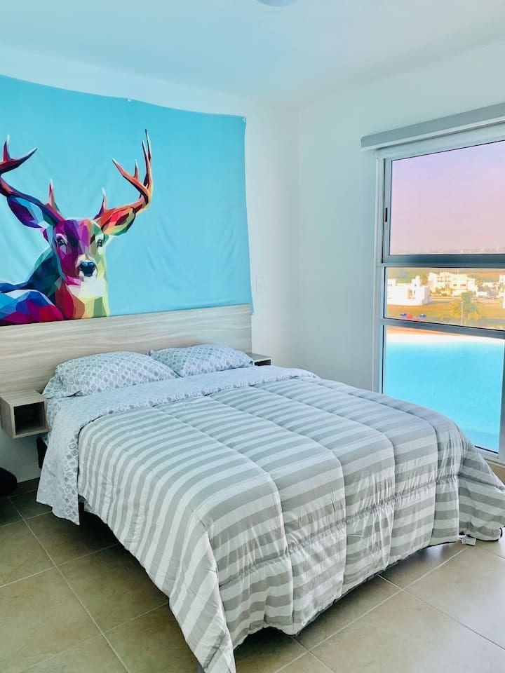 Incredible view in a two-bedroom apartment: access to the lagoon, swimming pool, paddleboarding, fully equipped kitchen, WiFi, living room, dining room, and much more. Our apartment is fully furnished and has an amazing view. If you're looking for a peaceful and pleasant place to spend a great vacation, look no further! You can access the lagoon and enjoy its pools. There's an Oxxo convenience store within the development, just 5 minutes away.