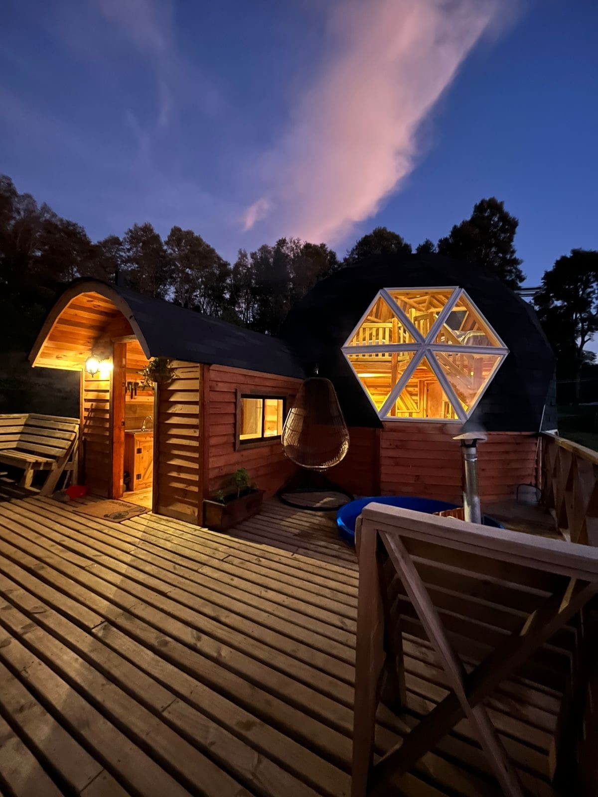 Domos Conguillío는 멜리페우코에서 2km 떨어진 토착 숲 정원에 마련된 글램핑 오두막과 돔 (화려하게 캠핑) 이 제공하는 적절한 휴식과 함께 멜리페우코 주변의 자연 환경이 제공하는 야외 활동을 완전히 개인적 차원에서 조화시키고자 하는 가족 운영 사업입니다. 돔 글램핑은 키친 라운지, 개인 욕실, 랩 어라운드 테라스가 있는 건물과 마찬가지로 나무 사이에 높게 지어졌습니다.
