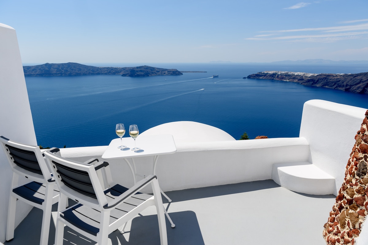 주니어 칼데라 바다 & 일몰 전망은 바다(에게해), 유명한 칼데라, 화산, 근처의 다른 키클라데스 섬들과 유명한 일몰이 내려다보이는 이메로비글리의 칼데라 림 꼭대기에 위치해 있습니다. 이 숙소에는 2인용 야외 자쿠지/미니 수영장/온수 제트 욕조가 있으며, 4세 미만의 어린이는 수용할 수 없습니다.