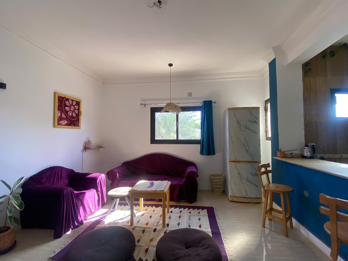 다하브에 있는 아늑한 숙소에 오신 것을 환영합니다! 1층에 위치한 '바다'를 통해 들어가는 아파트에서는 사진과 같이 야자나무 가지와 햇살을 통해 아름다운 바다 전망을 감상할 수 있습니다. 이 넓은 침실 1개의 아파트는 우리가 사랑하는 다합의 유기농 자연 라이프스타일을 반영하는 수제 가구와 액세서리로 가득합니다. 해변 바로 옆 2번째 줄에 위치해 있으며, 아살라 시장까지 도보로 단 3분, 등대까지 도보로 10분 거리에 있습니다.