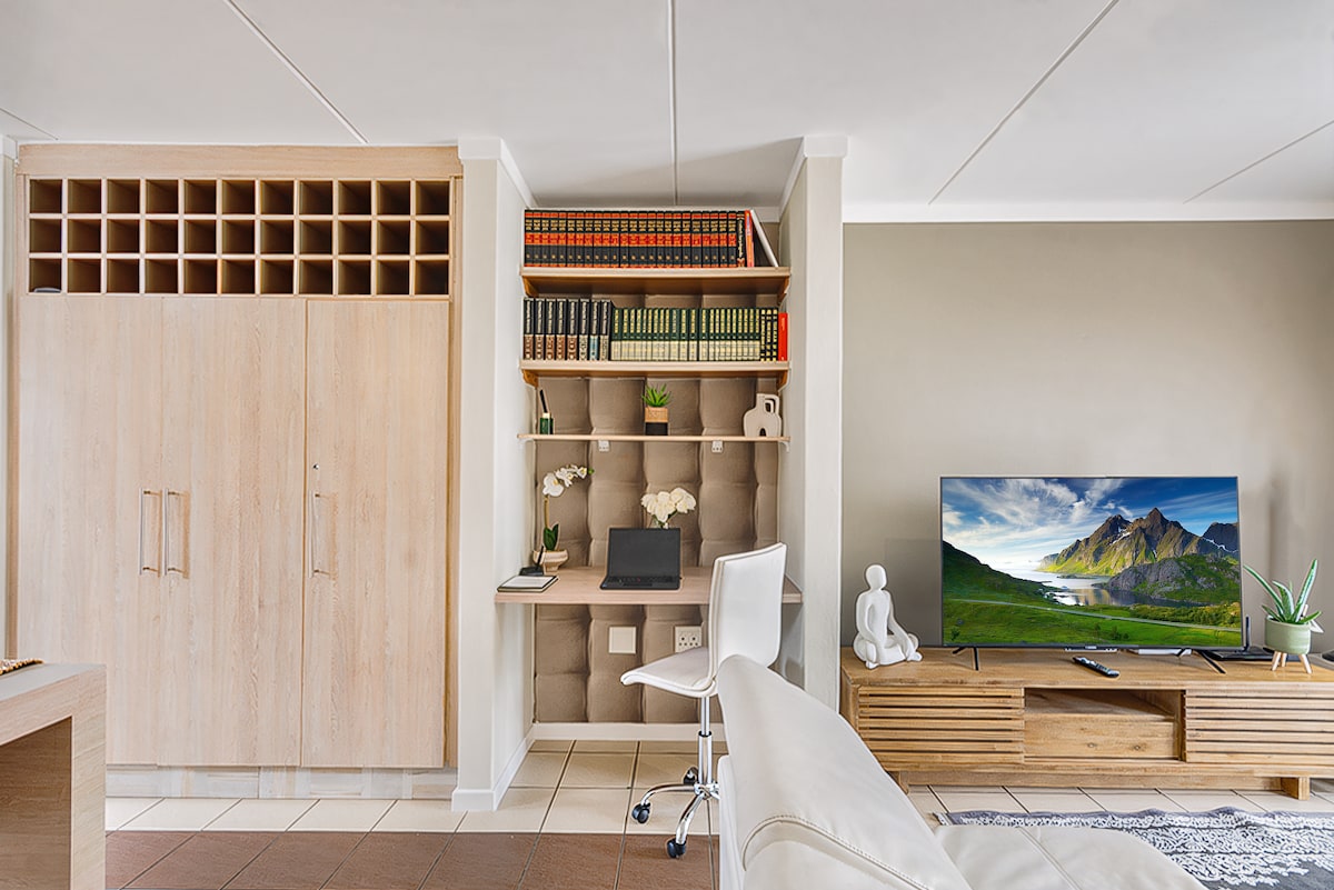 A 5 star ⭐️ affordable relaxing space. Spacious 1-bed, 1-bath & shower combo. A loadshedding -friendly cosy, stunning apartment incorporating a study area. Perfect for business or leisure stay. Set in a secure tranquil estate, garden view and pool. Located in the heart of the nothern business and shopping district. Shopping center is walking distance. Close to Lanseria Airport. 5min to Fourways mall & hospital.