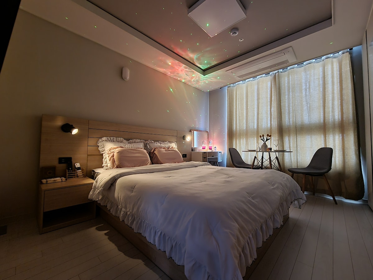 중심부에 자리하여숙소 설명 ✅꼭 필독✅해 주시고 이용해 주세요!! ♥️"잠자리"라는 기본에 가장 충실하려고 "노력"한 공간입니다! ✅숙소 옵션✅ -삼성 스마트 TV -초고속 wifi지원 -삼성 시스템 에어컨 -삼성 스타일러 -드럼 세탁기 -일리 커피머신기(캡슐제공) -커피 포트기 -토스트기 ✅숙소 주방 옵셔✅ -인덕션 2구 -머그잔/와인잔/소주잔 -앞 접시 / 중 접시 -냄비 2개 (중,대) -조리도구(국자,도마,칼,가위) -수저셋트 (4인 인준) 🙏저희 숙소는 간단한 조리만 가능 하세여 참고해 주세여! ✅화장실/샤워실 옵션✅ -핸드위시 -폼클랜징 , 클랜징 오일 -샴프/컨디셔너/바디워시 -바디로션 -화장솜 , 면봉 -헤어드라이기, 고데기 입지적 편리함과 세련된 스타일을 모두 갖춘 공간입니다.