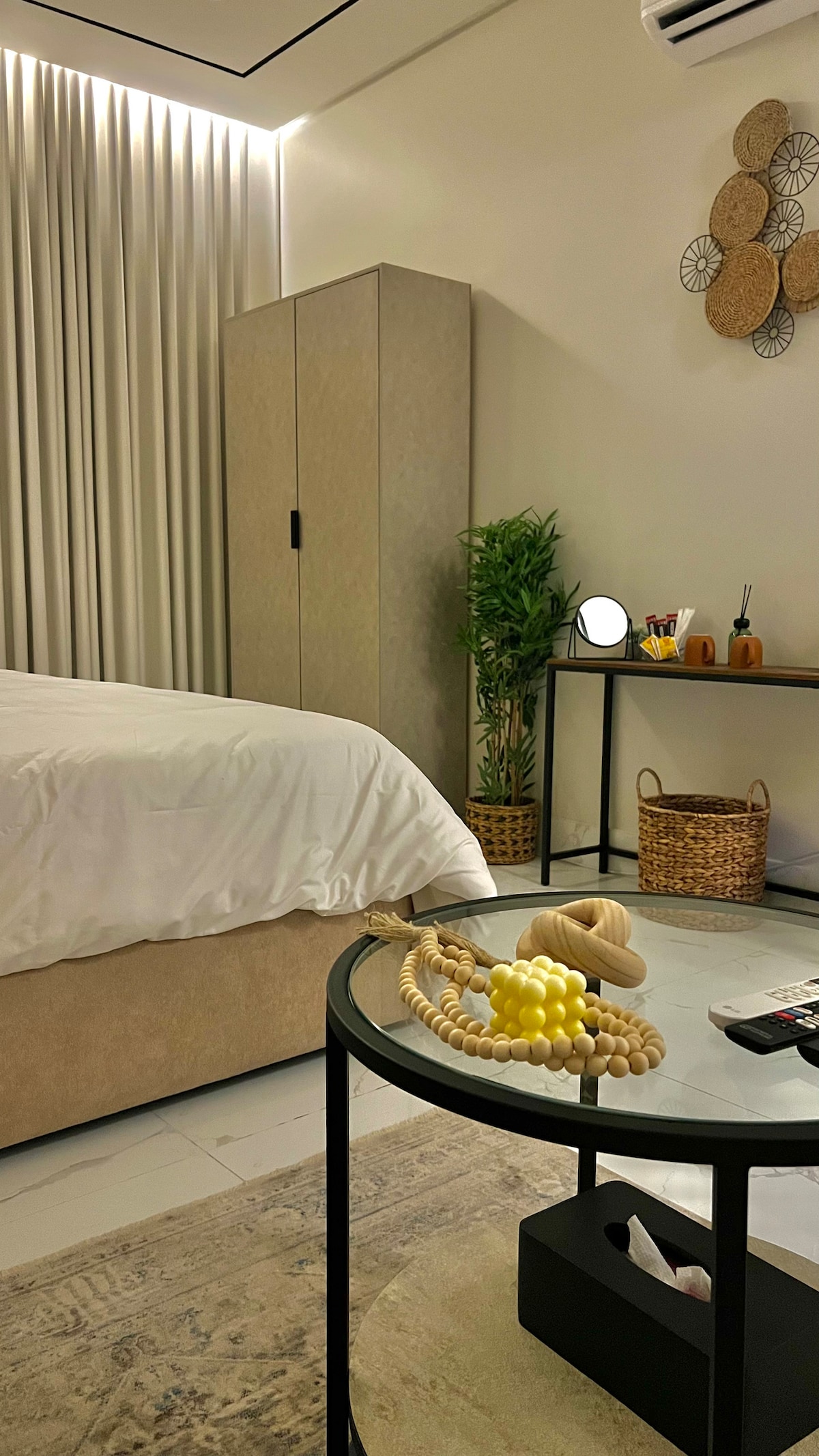 Welcome to our stylish studio apartment in Khobar. This modern space is perfect for solo travelers or couples seeking comfort and entertainment. The studio features a comfortable bed and sofa, a well-equipped coffee corner, a cabinet. Enjoy your favorite shows on the 60" Smart TV. Whether you're catching up on your favorite series or enjoying a movie night, the entertainment is at your fingertips. High speed fiber internet has been installed!