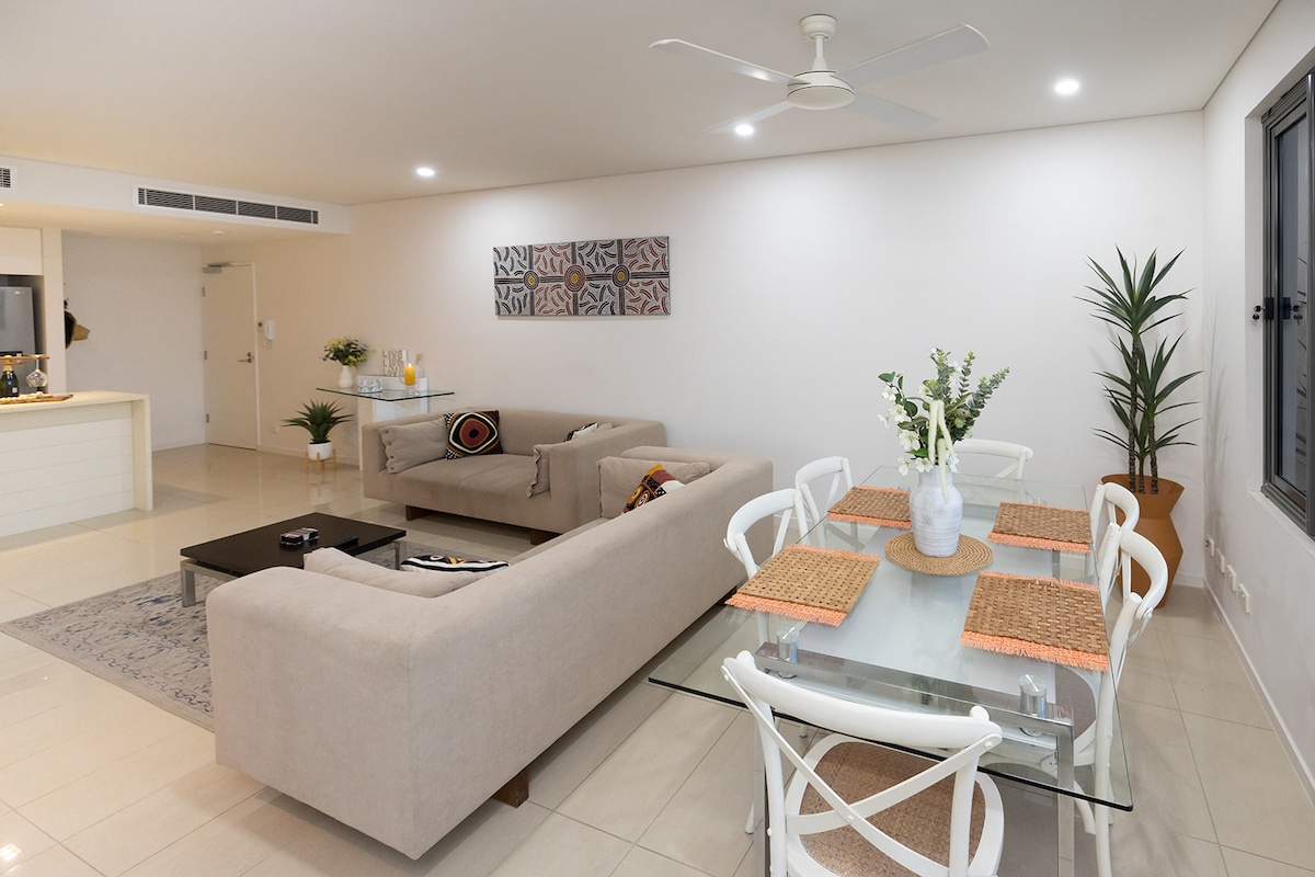 Welcome to your Darwin city getaway Modern one bedroom apartment features: -Bedroom, Queen bed, aircon & tv. -Seperate fully equipped kitchen -Seperate bathroom - Lounge,dining , study, tv -Washing machine and Dryer -FREE Parking onsite for 1 car -WIFI available Stunning balcony views over the waterfront Walking distance to restaurants, shops, waterfront and more. The complex facilities include a large outdoor resort swimming pool, gym and onsite restaurant open daily
