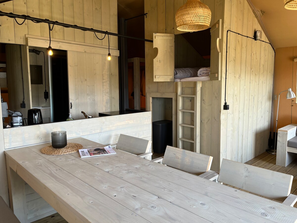 6인용 넓은 사파리 텐트에서 글램핑을 경험해 보세요! 편안한 더블 침대 1개와 이층 침대 2개가 있어 가족이나 친구를 위한 넉넉한 공간이 있습니다. 프리지아 시골, 푸르른 풍경, 전통 농장, 진정한 평온을 만끽하세요. 주변에 위생 시설이 있고, 아늑한 야외 공간이 있으며, 빵 서비스가 제공됩니다. 침구 패키지를 이용할 수 있습니다. 프리즈란트를 둘러보기에 완벽한 위치에 있습니다. 2025/2026년 겨울에 편안함을 더하기 위한 업데이트가 예정되어 있습니다!