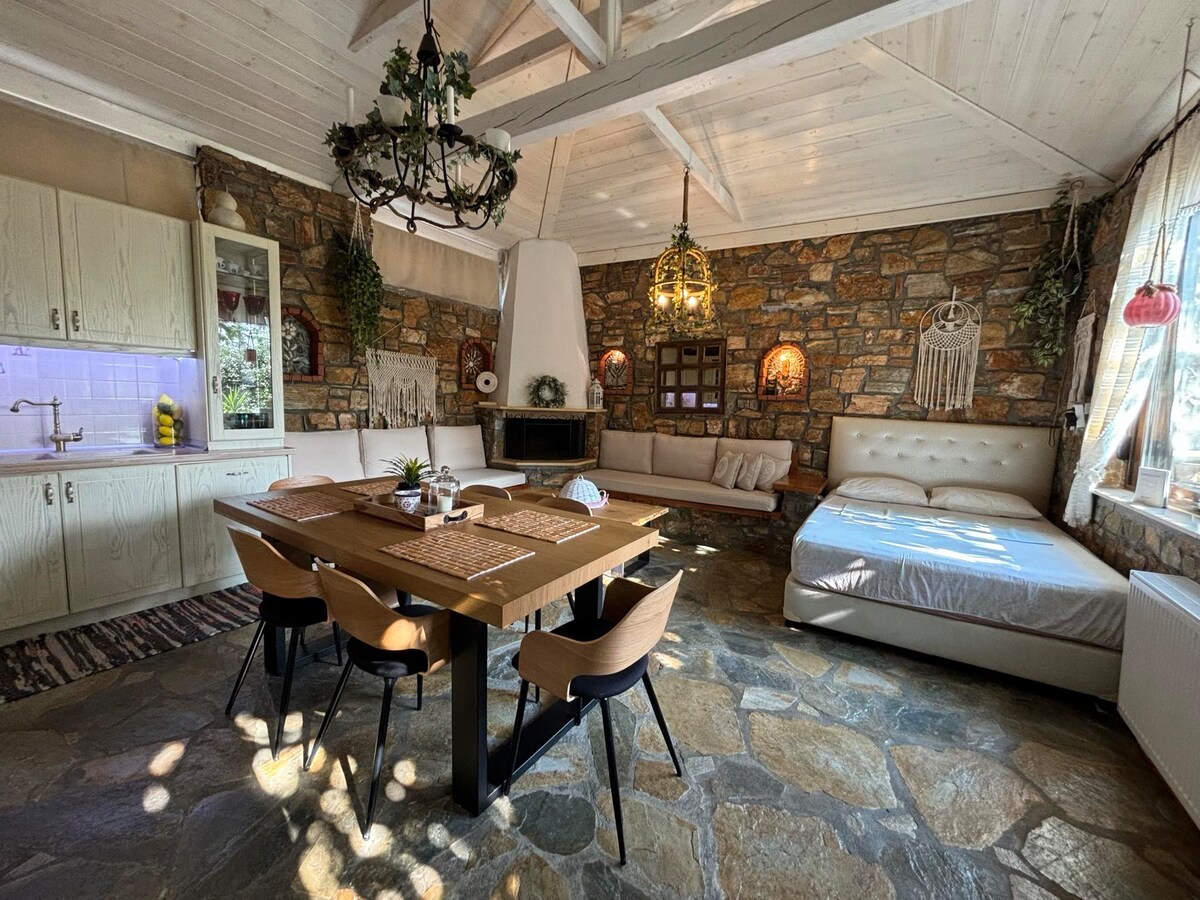높은 천장, 벽난로, 완비된 주방, 샤워기가 있는 화장실이 있는 대형 스튜디오입니다. 더블 베드 1개와 침대로 변신하는 빌트인 소파 2개가 있습니다. 이 전원주택은 더 큰 집의 뒷편에 있지만 전용 정원이 있습니다. Ενιαίος χώρος με μεγάλη κουίνα, μπάνιο, διπλό κρεβάτι καναναπέδες που γίνονται κρεβάτια.