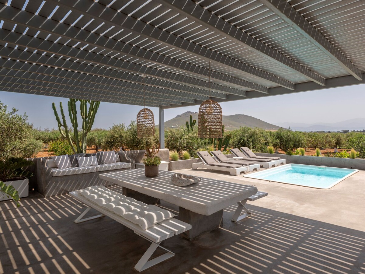 Near Parikia (main town) and Pounda (ferry to Antiparos), this 180 sq. m. (1,940 sq. ft.) villa offers stunning mountain and sea views. Set in a quiet agricultural area, 3 km from Parikia, it ensures total privacy with spacious outdoor areas and a large swimming pool. A hidden path leads to the sandy Parasporos Beach. Thoughtfully decorated by its owner, the villa blends Feng Shui principles with traditional elements, natural materials, and soothing tones to create a tranquil retreat.