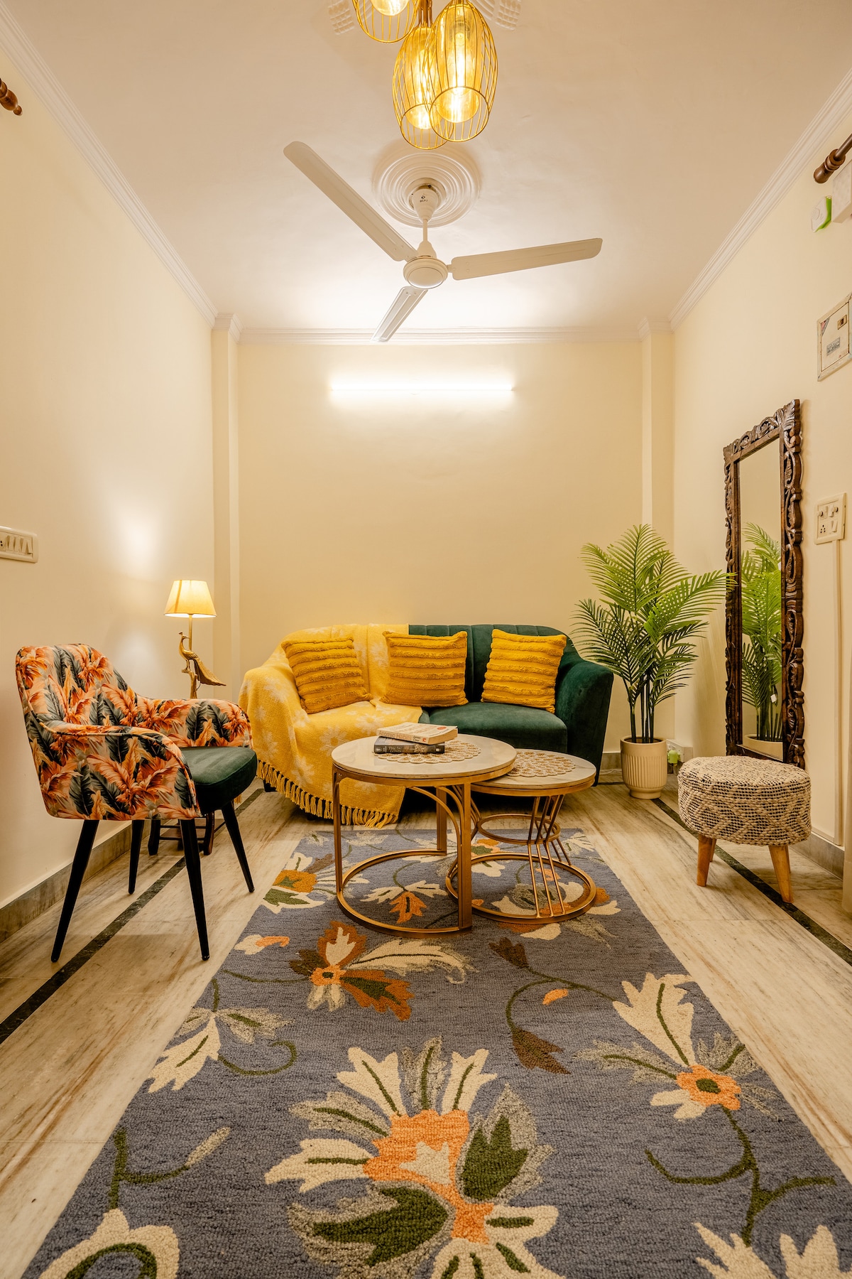 Do you want to bond with family, friends or colleagues in the lap of nature in New Delhi? Do you wish to experience the ideal blend of old-world charm and hospitality with all modern amenities? Do you desire to take a stroll in sprawling lawns under fruit trees or lie in wait for peacocks? If YES then this independent 3-bedroom apartment of Shiv Niwas villa, with private balconies & roof terrace, smart locks, property-wide high-speed Wi-Fi, free car parking & caring lady caretaker-cooks BECKONS!