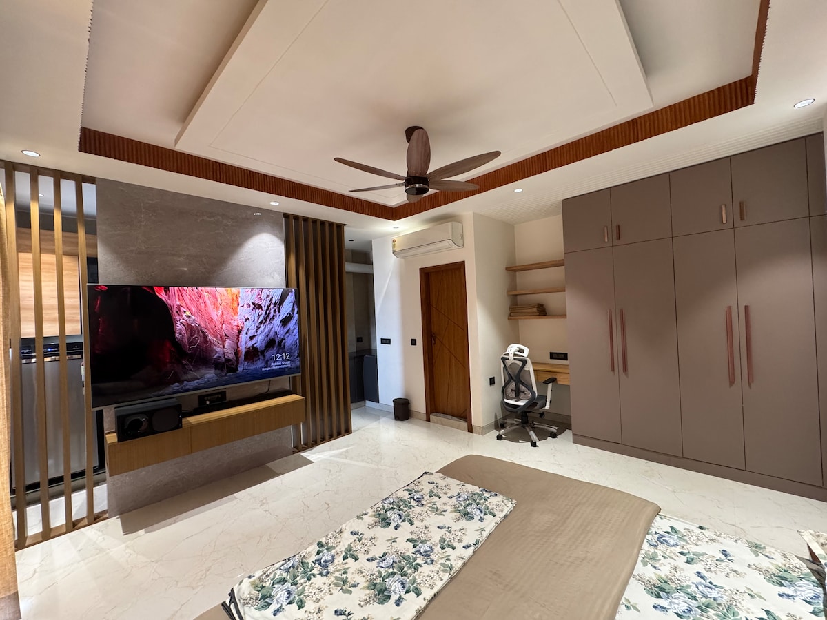 BLUO STAYS - Award winning Sanitized Homes! Private Studio (450 sq ft) in Green Park across Main Market, walking distance from Hauz Khas Village & Green Park Metro Station! It has large bay window for sunlight, King Bed, Bathroom, Work Desk, Couch, Dining & Full Kitchen with Stovetop Gas, Refrigerator, Microwave, Cookware etc. All-inclusive Daily Tariff - high speed WiFi Internet, TataSky TV, Cleaning, Washing Machine, Utilities, Parking, Power Backup..