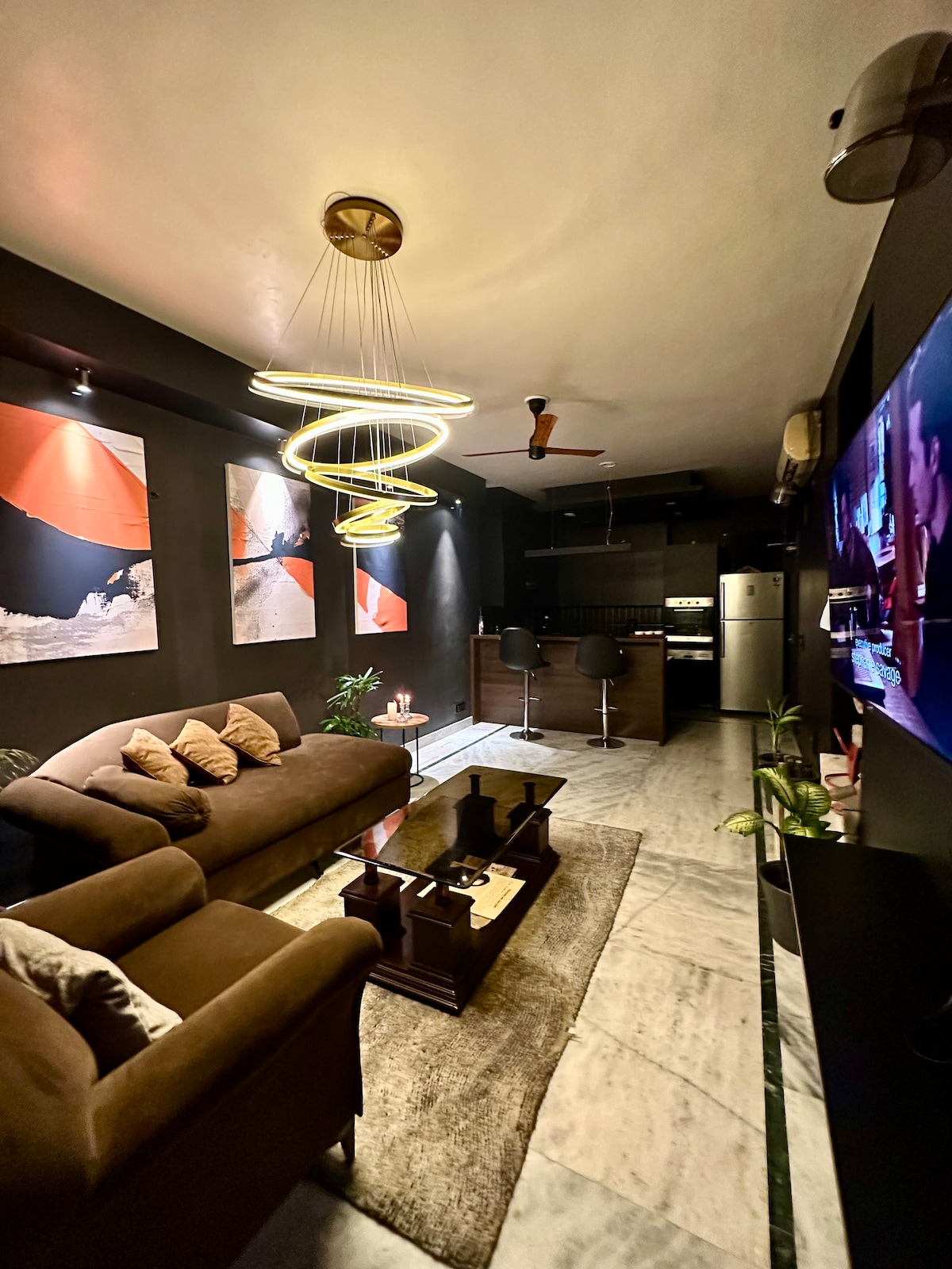 Noir is a one-bedroom residence in GK 1 designed with a dark, tonal palette and clean lines. A king bed with an ensuite bath anchors the private space, while the living area opens to a balcony and a 55" smart TV on a hinge mount. A fully equipped kitchen with a built-in breakfast counter supports longer stays. The bedroom carries its own 42" TV and private balcony. Split ACs in both rooms, inverter backup and 200 Mbps Wi-Fi keep work and rest seamless. Staircase access to the 2nd floor.