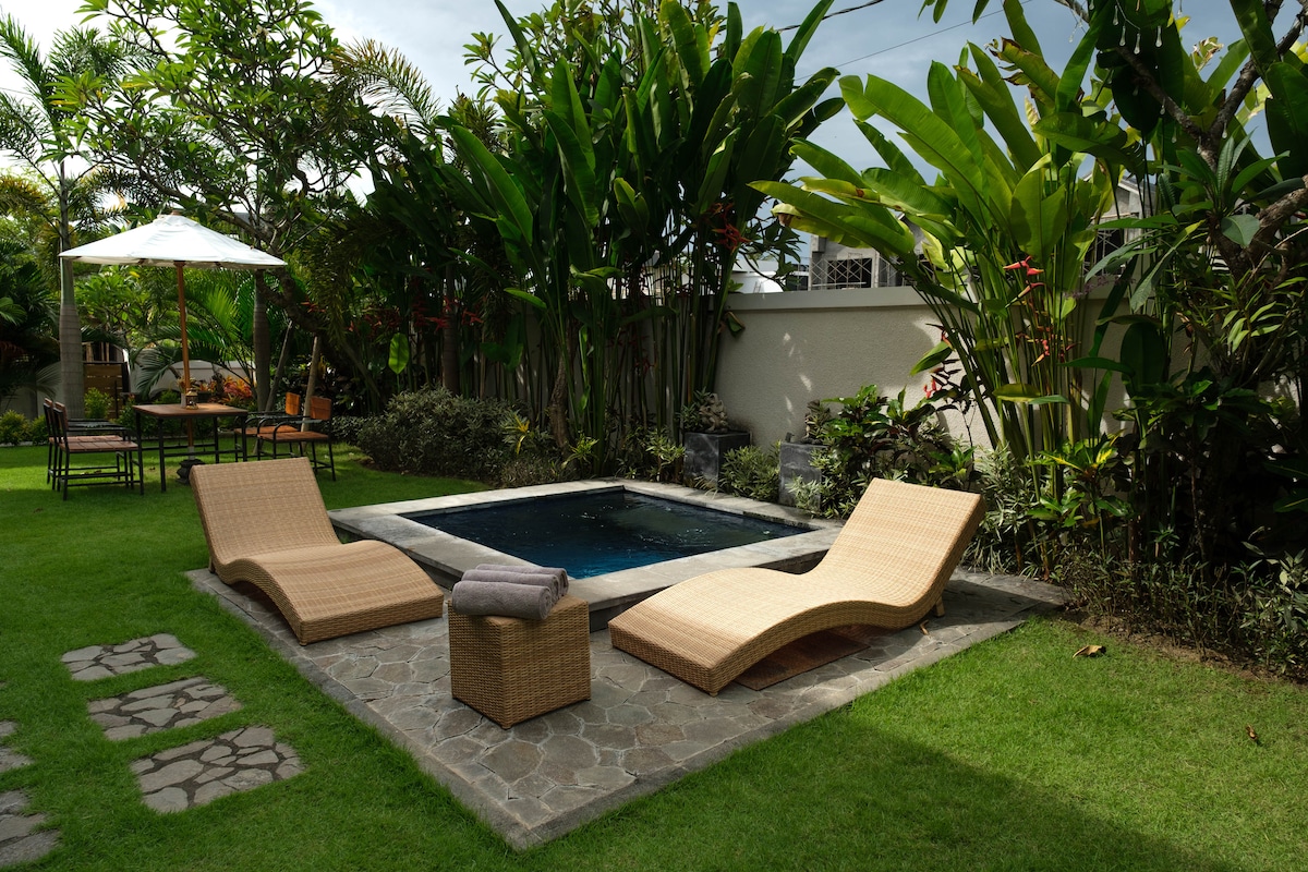 도심의 게스트용 별채 북적거리는 한복판에 있지만 조용합니다. 전용 수영장 | 녹색 정원 | 편안한 현대적인 공간 쇼핑몰, 레스토랑, 엔터테인먼트 센터 근처. 공항까지(22분), 쿠타까지(16분), 스미냑까지(13분), 캉구까지(21분) 스테이케이션, 가족 휴가, 개인 이벤트에 적합합니다.