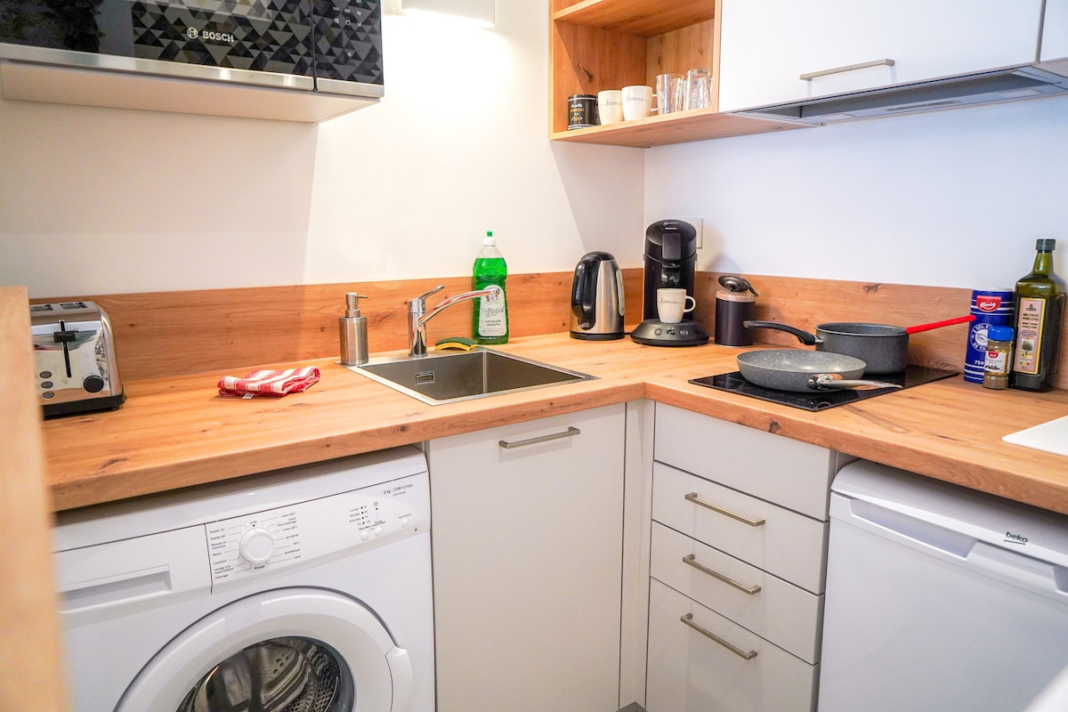 도심에 위치한 38m²의 연결형 주택에서 편리한 주차 시설을 갖추고 있으며 시설이 매우 잘 갖춰져 있습니다. 1층에 있는 160cm 침대가 있는 아름다운 침실 공간을 즐기세요. 샤워기와 세면도구가 구비된 아틀리에 스타일의 욕실과 아름다운 주방으로 연결되는 아늑한 라운지 공간을 갖추고 있습니다. 90cm 침대 2개가 있는 중이층은 오리지널의 예쁜 사다리를 통해 접근할 수 있습니다. 모든 것에 가까운 이상적인 위치!