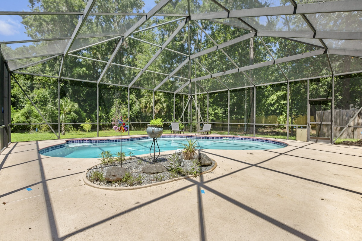 Modern 3BR Pool Home • 5 Mins to UF & Downtown 🏊 Modern 3BR home with private pool & patio 🚗 5 min to UF campus, stadium & downtown dining 🍳 Fully stocked kitchen + spacious living areas 🛏️ King bed + comfy bedrooms for restful sleep 🔥 Firepit & outdoor lounge for evening gatherings ✅ Free parking, WiFi & easy self check-in ✨ Relax & recharge in a private pool retreat just minutes from UF and Downtown Gainesville. Perfect for families, groups, or game-day stays. BOOK NOW! Dates fill fast!