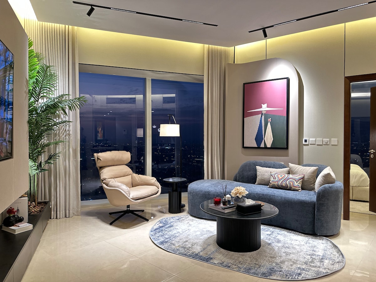 Stay in a beautiful, fully furnished apartment on the 61st floor of the Rafal Residential and Hotel Tower. Enjoy breathtaking northern views, modern amenities, and easy access to Riyadh's top attractions. Public parking available in front of the premises.