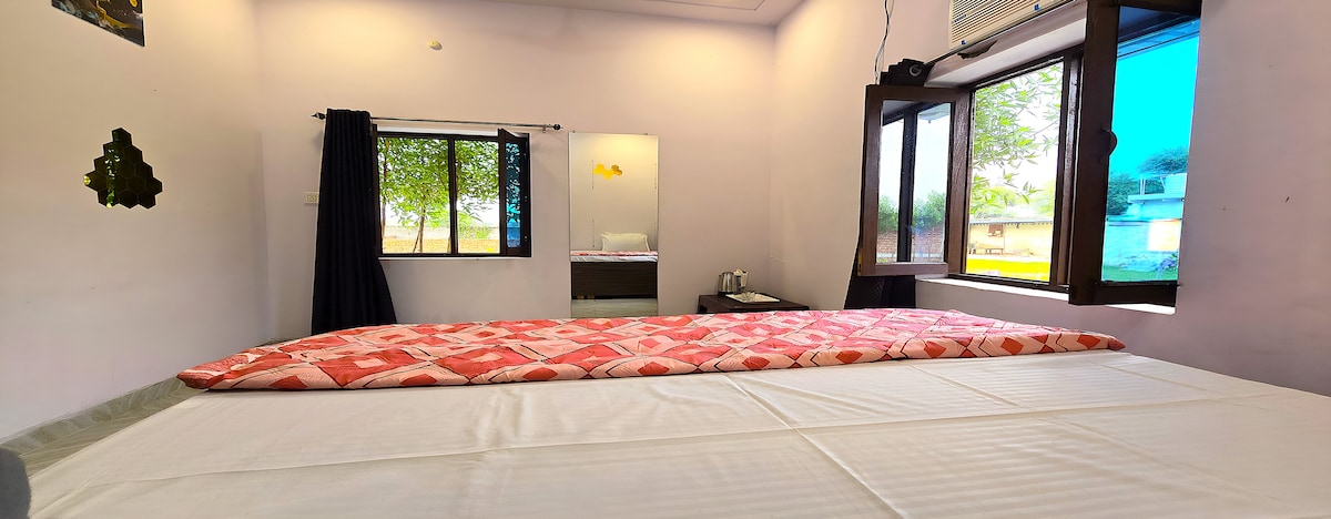Escape the hustle and bustle of city life at our spacious, peaceful, and pet-friendly property in Mathura. Surrounded by greenery, our retreat offers fresh, clean air and a tranquil atmosphere. Though away from city noise, we're just a 30-minute drive from the famous temples of Mathura and Vrindavan. With ample space and a fully fenced area, your pets can roam safely. Whether you're relaxing in nature or exploring nearby spiritual sites, our retreat is the perfect place to recharge andreconnect