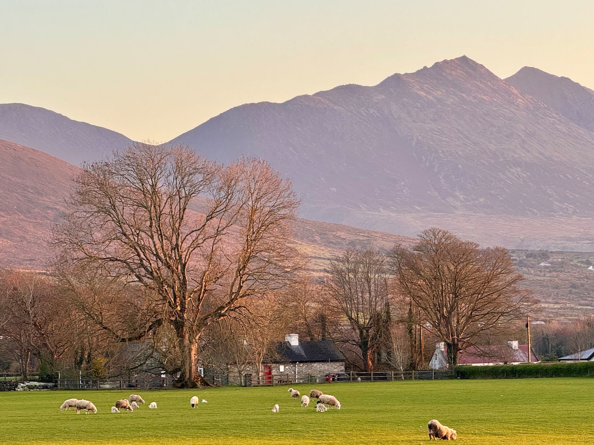 This picturesque cottage is located on a traditional Irish farm with stunning views of the McGillycuddy Reeks. It is only 2 miles from Killorglin town, home of the annual Puck Fair festival. Serving as an ideal base for exploring the famous Ring of Kerry, the Wild Atlantic Way, it is only 20 km from the beautiful town of Killarney or a drive to Dingle. Suitable for nature-lovers, climbers, artists, families and those who want to escape from it all.