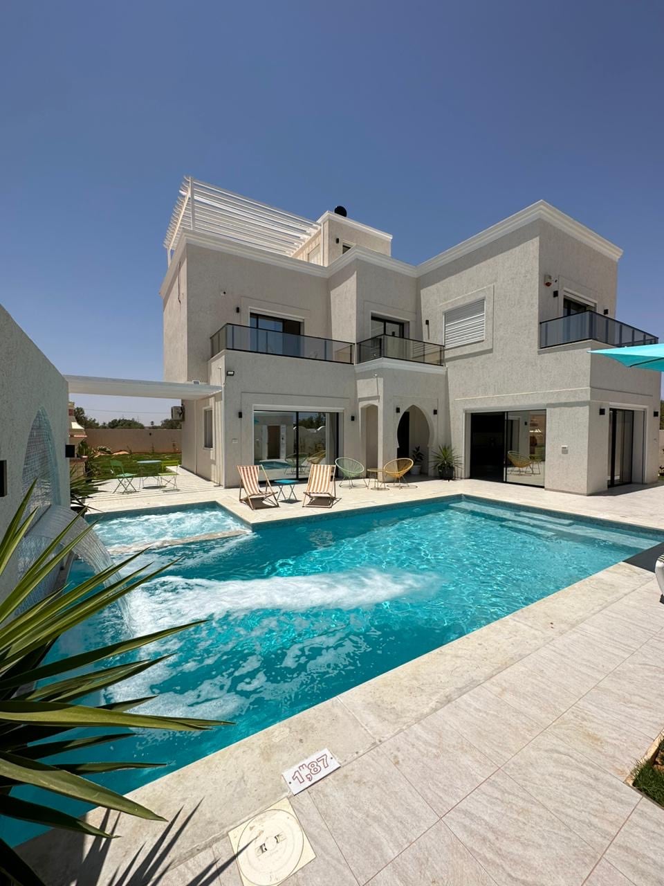 Villa AYOUB Situeฬe aฬ Tazdaine, Midoun, la maison se compose de : - 4 suites parentales dont 3 a lโeฬtage et une au RDC. - Superbe double salon et salle aฬ manger. - Cuisine moderne qui donne sur le salon et salle aฬ manger style ameฬricain . - 4 salles de bain. - 5 salles dโeau. - Jardin gazonneฬ avec espace de plantes. - salle aฬ manger exteฬrieur . - BBQ. - Piscine debordement avec cascad 9/4 Sans Vis aฬ Vis. - Systeฬme dโalarme et cameฬras de surveillance 24/24 . - Acceฬs internet.