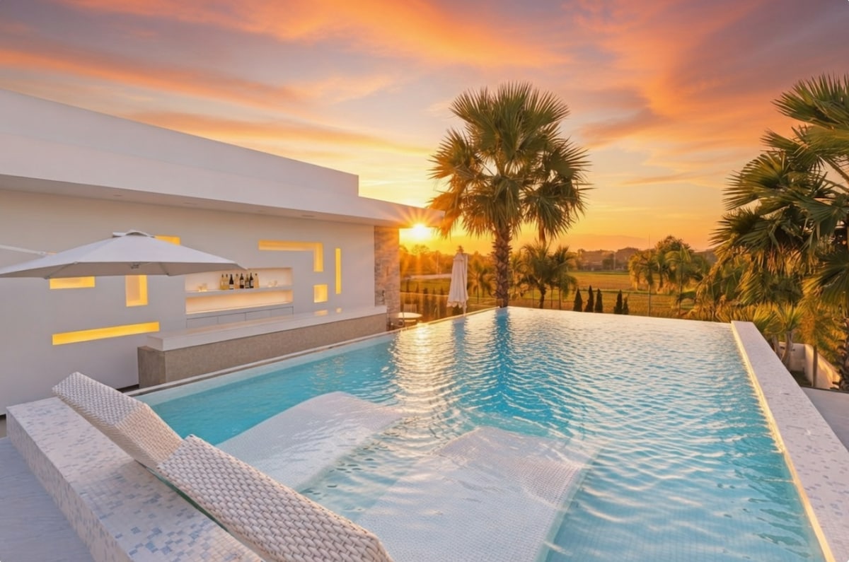 명성 높은 '베스트 빌라 건축 디자인 치앙마이 2022' 상을 수상한 팜 빌라에서 고급스러운 생활의 정수를 경험하세요! 웅장한 산 전망을 자랑하는 고요한 논 사이에 자리한 현대적인 저택으로 비교할 수 없는 5성급 리조트 스타일의 숙박을 약속합니다. 한 지붕 아래에서 궁극의 프라이버시, 휴식, 모험을 즐기세요. 팜 빌라로 탈출하여 치앙마이의 다른 빌라와는 다른 비교할 수 없는 고급스러운 세계를 발견하세요.