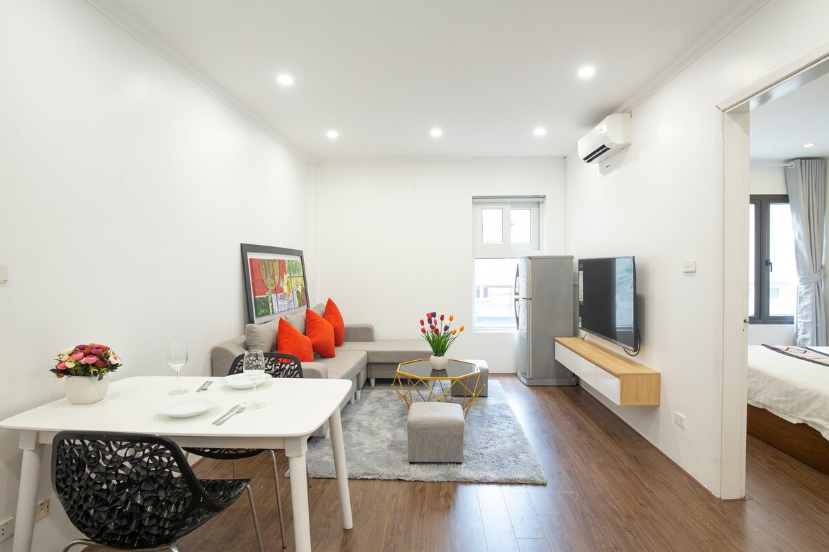 sUMITOMO BUILDING FOR RENT 1 BEDROOM APARTMENT in Kim Ma street, right next to Lotte commercial center, Ngoc Khanh lake, Japanese embassy,... convenient transportation location near the streets: Dao Tan, Linh Lang, Lieu Giai, Ngu Chi Thanh, utility services such as: dining, entertainment, laundry,... right next to