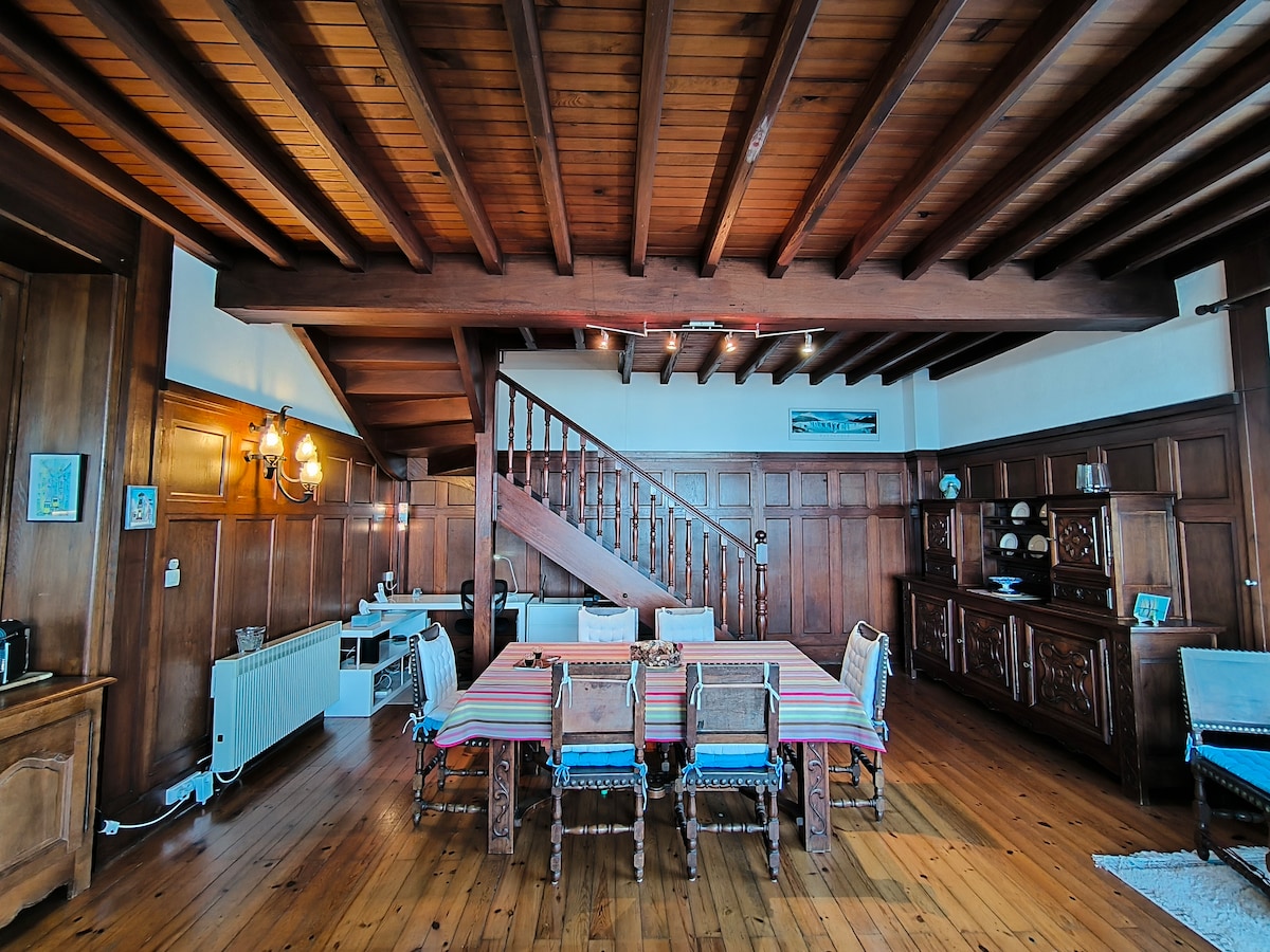 바스크 해안에서 100m 거리에 있는 보리바주의 트렌디한 지역에 위치한 이 아파트는 바다와 산의 파노라마 전망을 자랑하며, 비아리츠 중심지에서 5분 거리에 있습니다. 바스크 주택 1층에 위치해 있으며 조용한 거리에 있습니다. 마스터 침실과 발코니에서 나무가 우거진 정원이 내려다 보입니다. 주차 공간. 2~4인에게 이상적입니다. 서핑, 재택 근무, 비아리츠와 바스크 해안 탐험에 이상적입니다. 2층에 거주하고 있으며 필요한 경우 연락 가능합니다.