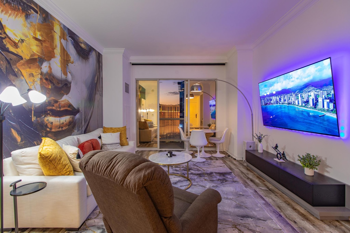 라스베이거스 스트립의 숨막히는 전망을 감상할 수 있는 발코니가 있는 39층 콘도에서 우아함의 정수를 경험해보세요. 이 세련된 휴양지는 현대적인 가구를 갖춘 깨끗하고 편안한 거실 공간을 제공합니다. 넓은 발코니에서 휴식을 취하며 활기찬 도시의 야경을 감상하실 수 있습니다. 고급스러운 라이프스타일을 추구하는 사람들에게 안성맞춤인 이 콘도는 편안함과 스타일을 결합하여 라스베이거스 중심가에서 비교할 수 없는 생활 경험을 선사합니다.