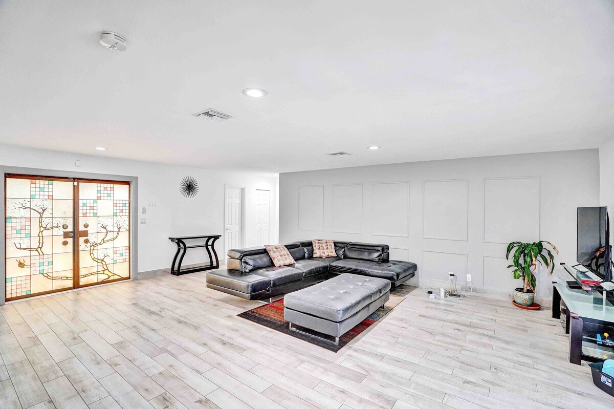 이 매우 넓은 고급 숙소에는 침실 4개/욕실 2개가 있으며 침대 9개가 있습니다. 차로 약 4분 거리 하드록스타디움, 탑골프에서 1마일 거리 와인우드, 디자인 디스트릭트로 이어지는 모든 주요 고속도로에서 가깝습니다. 사우스 비치까지 차로 약 15분 거리, 마이애미 공항/다양한 문화 음식과 쇼핑까지 차로 15분 거리 비디오 아케이드 게임 2개가 있는 당구대. 매우 개방적이고 넓은 구조로 조명이 많습니다. 개방형 구조의 주방 및 바비큐 그릴, 그네 세트, 거대한 블루투스 스피커, 16개 이상의 라운지 의자가 있습니다. 온수 수영장 옆에서 게임을 즐기실 수 있습니다!