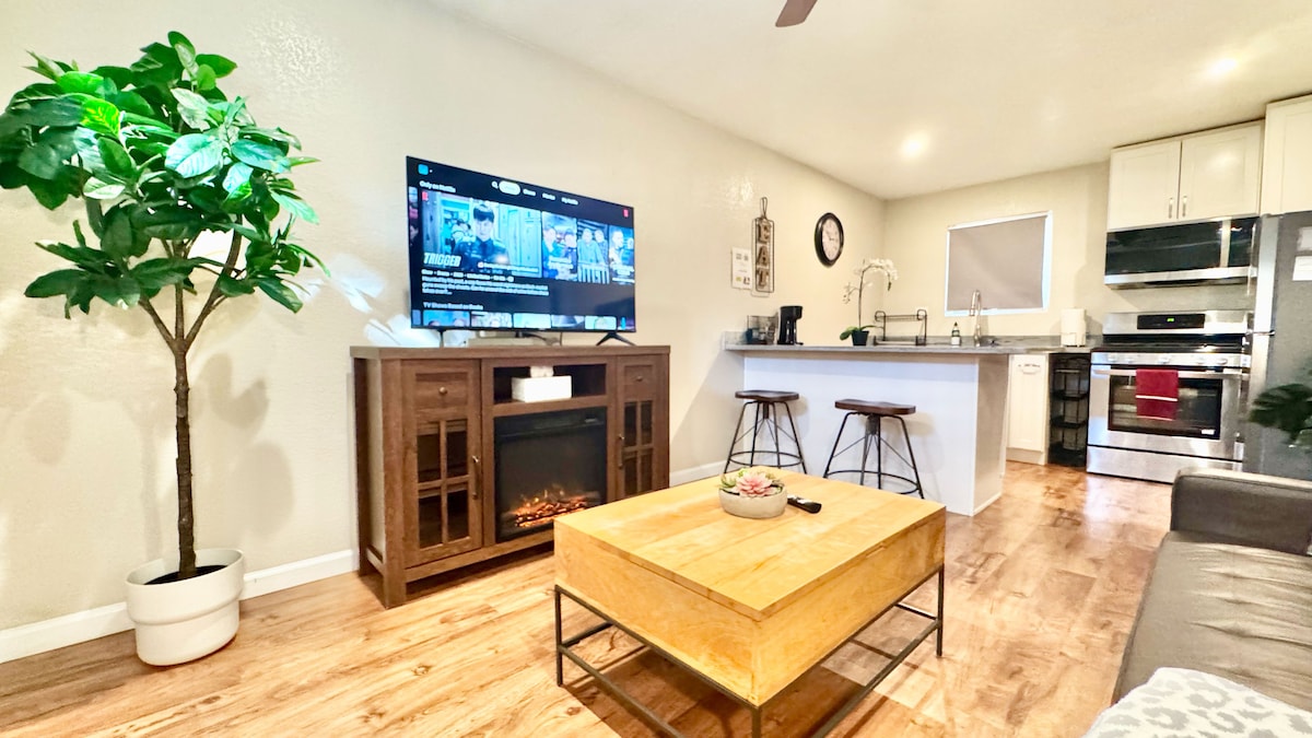 Our lovingly newly designed modern, but SMALL cozy studio is perfect for solo or couple. Small private patio, parking w/secure gate, electric fireplace, bidet, rainfall shower, upscale tile, LED mirror, Keurig, desk, strong Wi-Fi, fully stocked kitchen w/ utensils and cookware. 8 min drive from SJC Airport, 7 min walk from Japantown restaurants/bars, 13 min walk from SJSU & City Hall, close to HWY 87, SAP Center, San Jose McEnery Convention Center, San Pedro Square and heart of downtown.