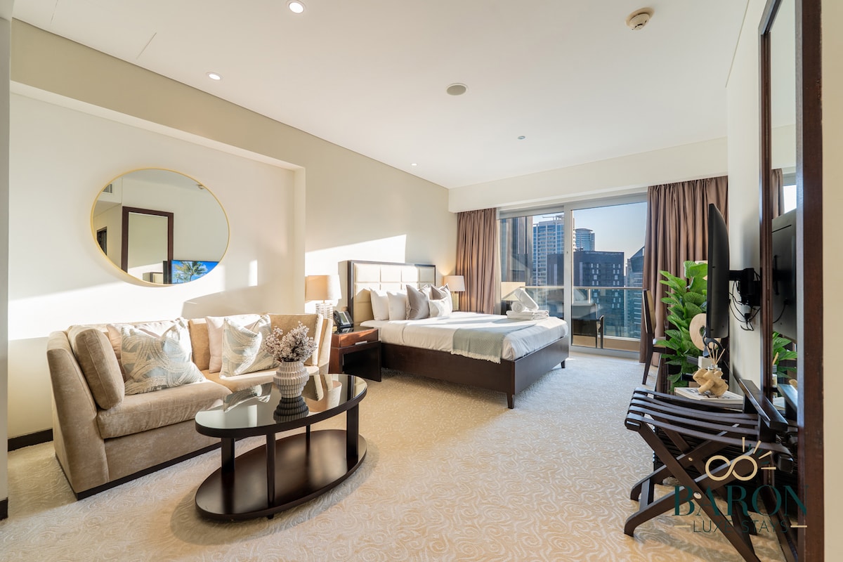 Stay at the best Address in Marina, located within JW Marriott Marina Hotel, with full access to the hotel's luxurious facilities. Enjoy the pool, gym, and world-class services, all while being directly connected to Marina Mall and easily accessible from Sheikh Zayed Road. The studio apartment boasts stunning city views, a king-size bed, spa-style bathroom, fully-equipped kitchen,TV, and a private balcony. Explore the vibrant Marina Walk with its shops, cafes, and waterfront.