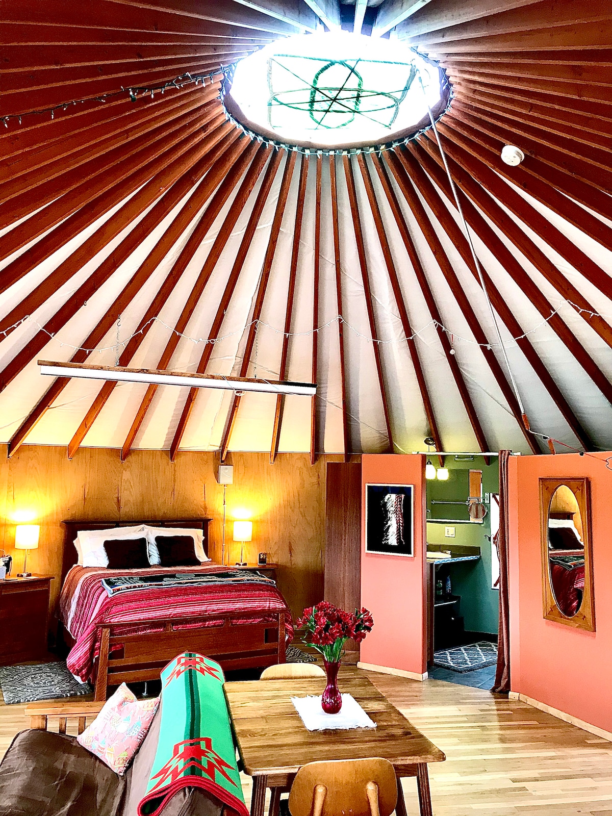 유르트는 도시의 열광에서 벗어난 특별한 피난처입니다. 산 사이로 높게(7600피트) 안전하게 자리잡고 있으며, 시볼라 국립 숲을 배경으로 사방으로 펼쳐진 전망을 자랑합니다. 엘크, 사슴, 코요테, 많은 새들이 우리와 함께 땅을 공유합니다. 어두운 밤하늘은 숨 막히게 아름답습니다. 유르트는 일몰 후 부드러운 오일 램프로 밝혀지는 오프 더 그리드입니다. 명상 산책을 위한 일곱 서킷 미로도 마련했습니다. 숙소에서 온수 욕조를 이용할 수 있습니다. 이 평화로운 곳에 오신 것을 환영합니다.