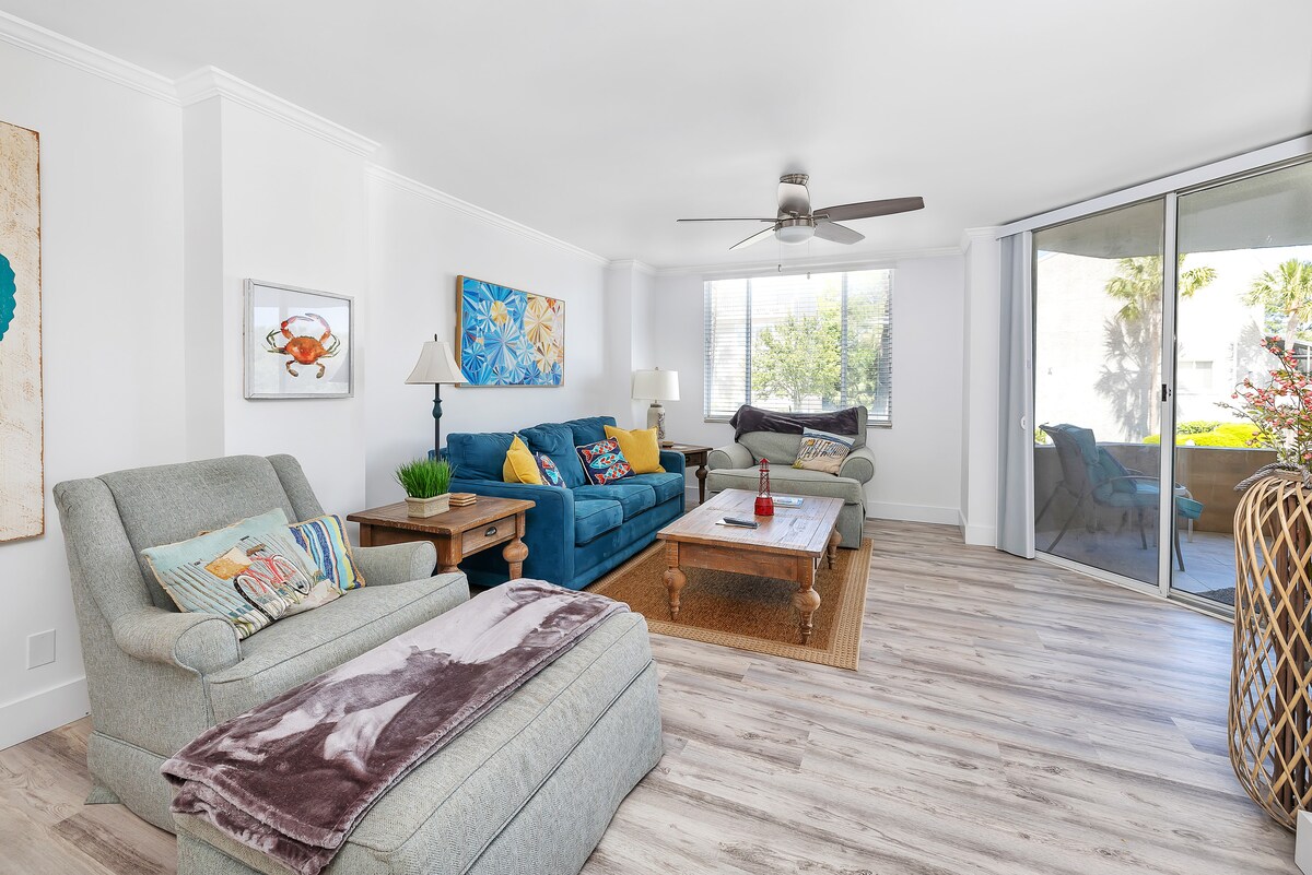 Comfort, relaxation, and beauty await you here - On the quieter and most private side of the Beach Club - with direct, gated beach access . Enjoy our oceanside saltwater pool, 2 hot tubs, and lush gardens - in the perfect spot, on one of the prettiest beaches in the South! Primary suite with king bed, walk-in shower/soaking tub. Second bedroom with 1 queen/ 1 twin, full bathroom. Well-equipped kitchen, full balcony... Come on, the dolphins are waiting for you!