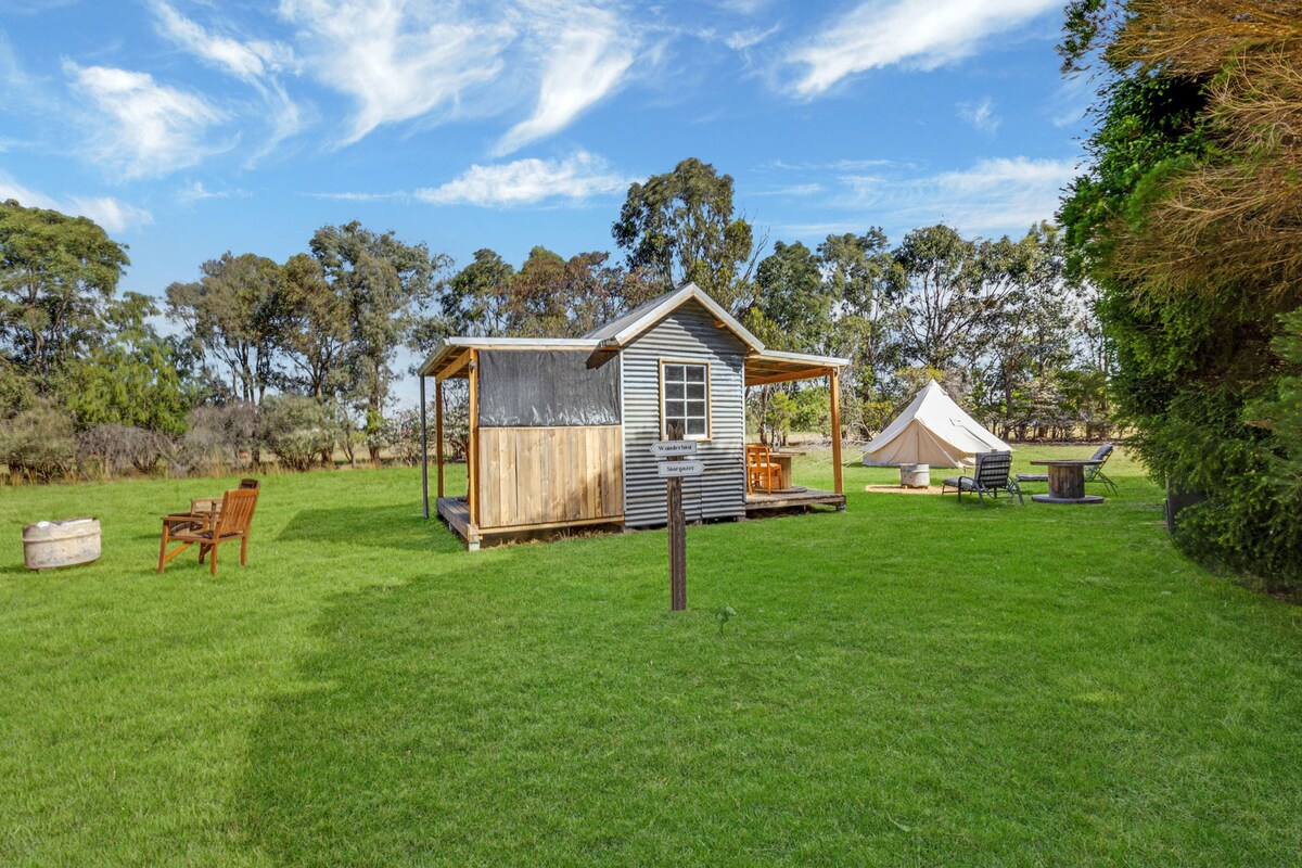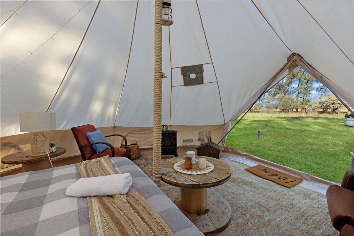 캠핑의 단순한 즐거움을 느껴보세요. 신선한 공기, 야생동물, 별이 빛나는 밤을 즐기면서 침대, 와이파이, 온수 샤워 등 현대적인 편의시설도 이용하실 수 있습니다. 이 넓은 종 모양의 텐트에는 고급스러운 퀸사이즈 침대, 새소리와 울창한 녹지로 둘러싸인 은밀한 조리 및 식사 공간이 있는 소형 캠프 주방이 있습니다. 우리의 매력적인 글램핑 텐트는 5개의 독특한 휴가용 전원주택과 함께 고요한 시골 숙소 내에 자리잡고 있습니다. 현대적인 필수시설을 갖추면서도 자연의 고요함을 즐길 수 있습니다.