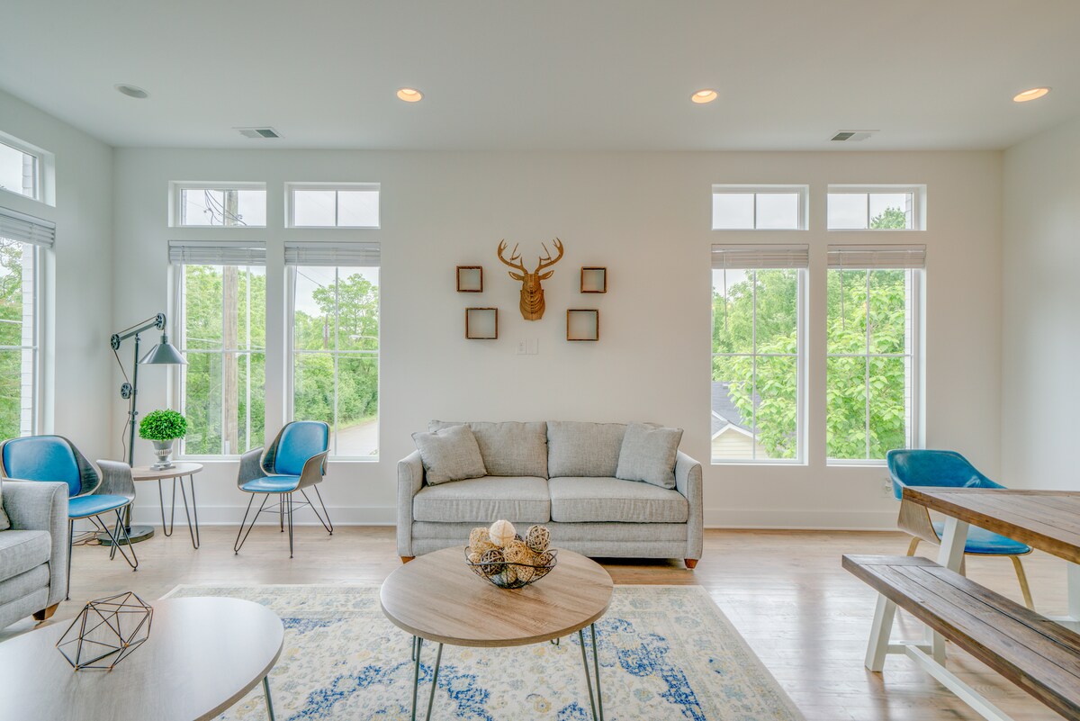 Welcome to our 2,200 sq ft three-story home built for groups who want space, entertainment, and a prime East Nashville location. Steps from Publix, Starbucks, Jeni's Ice Cream, Pearl Diver, and Tailgate Brewery. With an 89 Walk Score, you may not even need a car. What you get: - 4 bedrooms, 4 bathrooms - Fully equipped kitchen - Washer & dryer - Fast WiFi - Karaoke machine - Movie room with surround sound - Disney+, Hulu, and ESPN+ - Instaworthy photo-ops - Coffee & tea